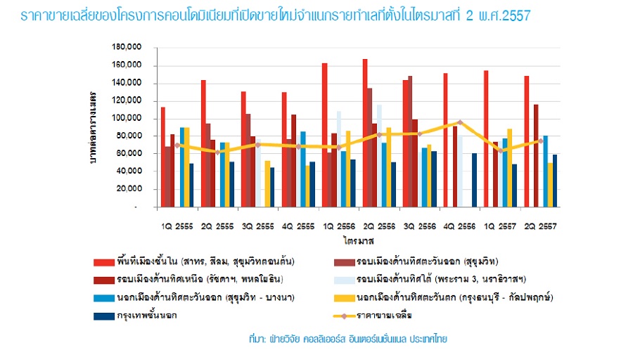 ในส่วนของราคาขายเฉลี่ย จากการสำรวจพบว่าราคาขายในพื้นที่เมืองชั้นในอยู่ที่ประมาณ 150,000 บาทต่อตารางเมตร มากกว่าราคาขายเฉลี่ยของทั้งกรุงเทพฯ ประมาณ 100% ในขณะที่ราคาขายเฉลี่ยของทุกทำเลอยู่ที่ 75,000 บาทต่อตารางเมตร มากกว่าไตรมาสก่อนหน้านี้ประมาณ 18% เนื่องจากมีโครงการเปิดขายใหม่หลายโครงการในเขตเมืองชั้นในใกล้กับรถไฟฟ้าและรถไฟใต้ดิน