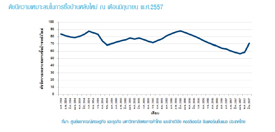 จากการสำรวจของศูนย์พยากรณ์เศรษฐกิจและธุรกิจ มหาวิทยาลัยหอการค้าไทย ณ เดือนมิถุนายน 2557 พบว่าดัชนีความเหมาะสมในการซื้อบ้านหลังใหม่เพิ่มขึ้นอย่างเห็นได้ชัด หลังจากที่ คสช.ได้มีการจัดตั้งคณะทำงานรวมทั้งออกนโยบายและมาตรการต่างๆ เพื่อขับเคลื่อนประเทศไทยอีกครั้ง ส่งผลให้คนไทยส่วนใหญ่มีความเชื่อมั่นมากขึ้นในการใช้จ่าย แม้ว่าดัชนีจะยังคงต่ำกว่าช่วงไตรมาสที่ 1 ปี 2556 แต่ถือว่ายังเป็นสัญญาณบวกสำหรับตลาดอสังหาฯ และหวังว่าจะเพิ่มขึ้นต่อไปในอนาคต