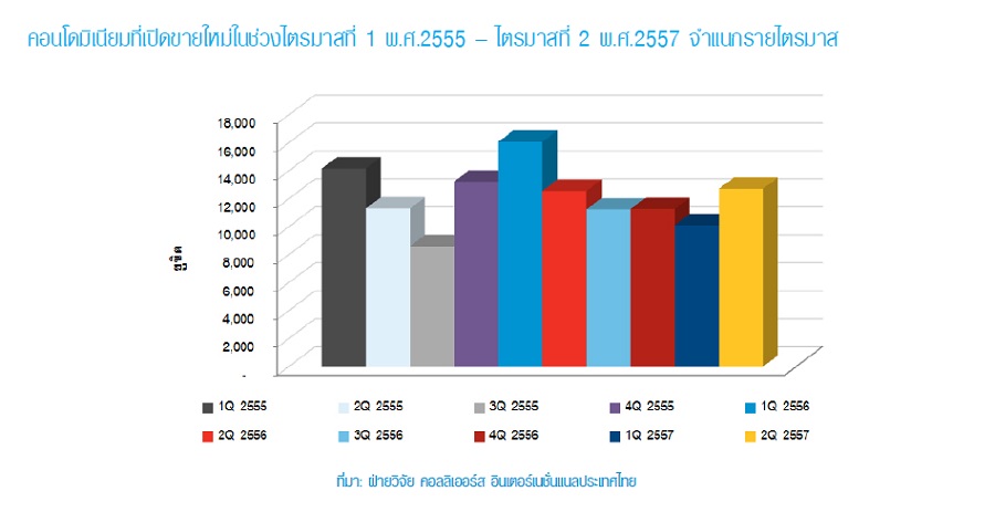 โดยในช่วงไตรมาส 2 ที่ผ่านมา ในเขตกรุงเทพฯ มีคอนโดฯ เปิดขายใหม่เพิ่มขึ้น 26% จากไตรมาสก่อนหน้านี้ แม้ว่าจำนวนของคอนโดฯ ที่เปิดขายทั้งหมดในครึ่งแรกของจะอยู่ที่ประมาณ 22,840 ยูนิต ลดลงจากช่วงเวลาเดียวกันของปีก่อนหน้านี้ประมาณ 20% ส่วนคอนโดฯ ที่สร้างเสร็จและจดทะเบียนกับกรมที่ดินในช่วงครึ่งแรกของปี 2557 นี้จะอยู่ที่ 16,670 ยูนิต โดยหลายโครงการเลื่อนกำหนดเล้วเสร็จมาจากปี 2556 เนื่องจากปัญหาการขาดแคลนแรงงานก่อสร้าง และผลกระทบจากผู้ประท้วงทางการเมือง