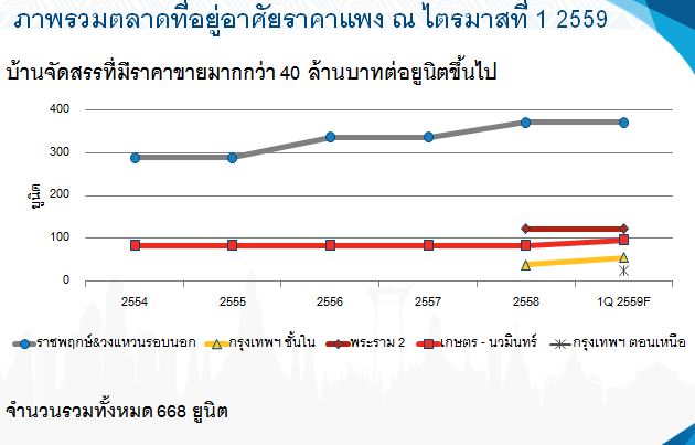 ทั้งนี้ ตลาดที่อยู่อาศัยในไตรมาสที่ 1 ปี 2559 อาจจะไม่ค่อยคึกคักเพราะว่าเศรษฐกิจที่อยู่ในช่วงชะลอตัว และผู้ประกอบรายใหญ่ต่างเร่งระบายสต็อกคอนโดมิเนียม และบ้านจัดสรรที่พร้อมโอนกรรมสิทธิ์ในช่วงที่รัฐบาลมีมาตรการลดหย่อนค่าธรรมเนียมการโอนกรรมสิทธิ์ ทำให้ข่าวการเปิดขายโครงการใหม่จากผู้ประกอบการรายกลาง รายเล็ก และรายใหม่มีมากกว่า รวมทั้งข่าวการเปิดขายโครงการบ้านจัดสรร และคอนโดมิเนียมในราคาแพงๆ ระดับมากกว่า 40 ล้านบาทขึ้นไปเข้ามาสร้างความน่าสนใจมากขึ้น