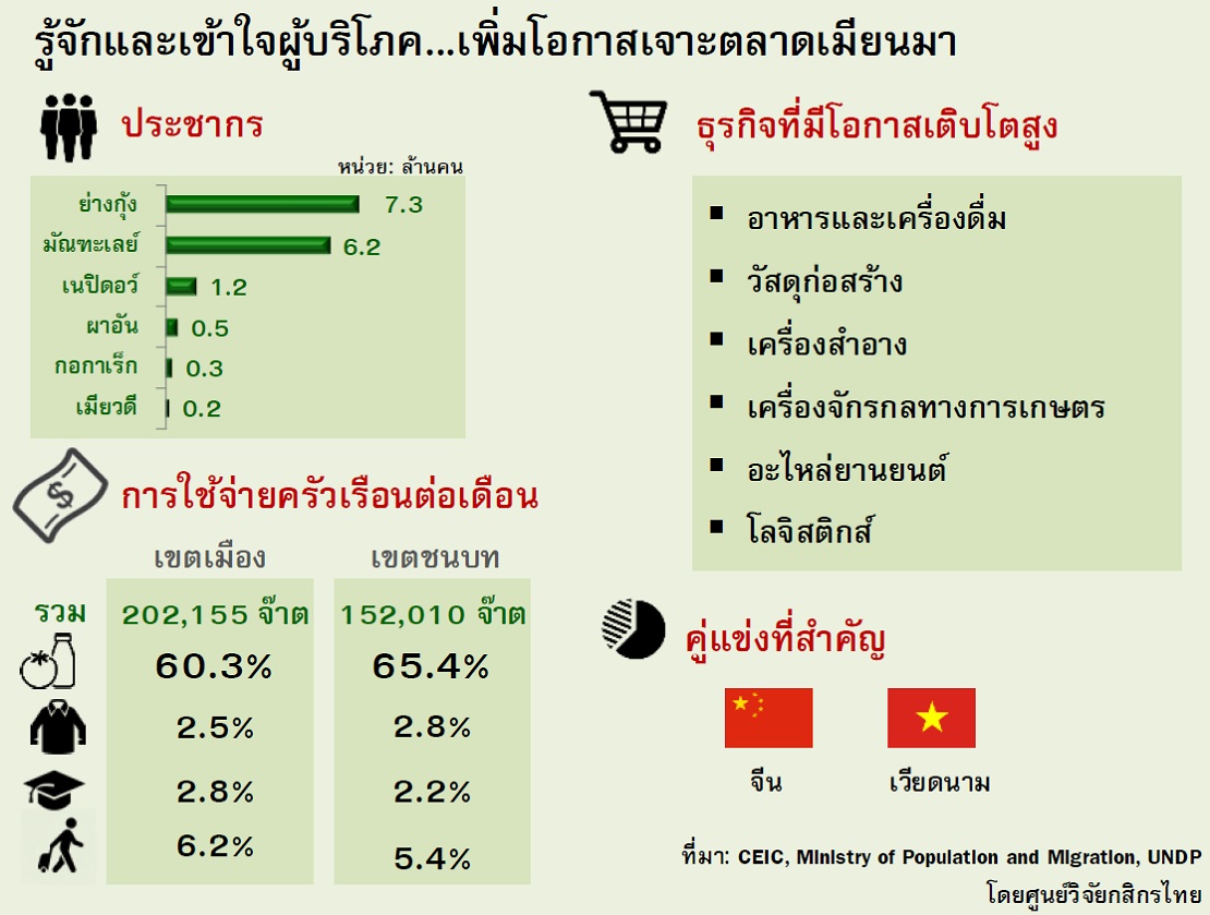 จากบทวิเคราะห์เศรษฐกิจโดยศูนย์วิจัยกสิกรไทยฉบับล่าสุดเผยว่า ไทยยังมีโอกาสที่ดีในการทำธุรกิจการค้ากับประเทศเพื่อนบ้านอย่างเมียนมาร์ แม้ในช่วงที่ผ่านมาเศรษฐกิจโลกกำลังอยู่ในช่วงชะลอตัว โดยเมียนมาร์นับเป็นประเทศคู่ค้าทางชายแดนที่สำคัญของไทยเป็นอันดับ 2 รองจากมาเลเซีย โดยมีสัดส่วนร้อยละ 21 ของมูลค่าการค้าชายแดนรวม ขณะที่ สปป.ลาวมีสัดส่วนร้อยละ 18 และกัมพูชามีสัดส่วนร้อยละ 12 ตามลำดับ