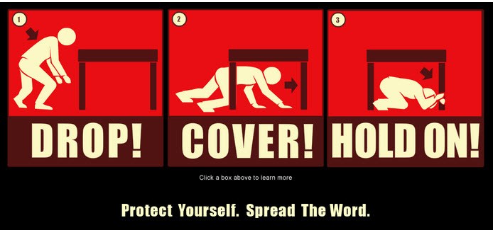 ซึ่งเป็นวิธีการมาตรฐานที่ใช้กันทั่วโลก โดยเมื่อรู้สึกถึงแรงสั่นสะเทือนของแผ่นดินไหว ให้หมอบในที่ราบ รีบมองหากำบังในจุดที่มีโครงสร้างแข็งแรง และพ้นจากแนวที่มีสิ่งของหรือวัสดุตกใส่ ก่อนที่จะใช้มือหนึ่งทำการยึดจับให้มั่นและอีกมือหนึ่งปิดส่วนท้ายทอยเอาไว้