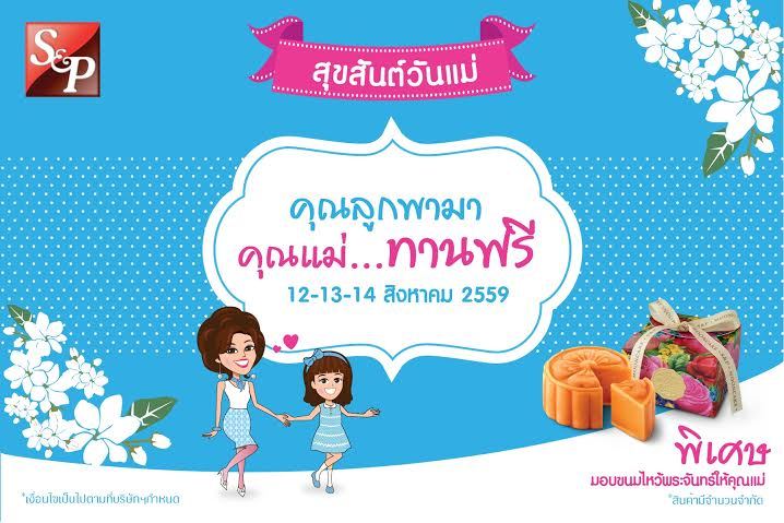 ชวนคุณแม่มาทานอาหารที่ร้านอาหาร S&P รับส่วนลด สูงสุด 50% พร้อมรับขนมไหว้พระจันทร์ ไส้คัสตาร์ด ขนาด 80 กรัม (1 ชิ้น ต่อ 1 โต๊ะ) ตั้งแต่วันที่ 12-14 สิงหาคม 2559 โดยส่วนลดสูงสุด 50% สำหรับคุณแม่ 1 ท่าน เมื่อมากับคุณลูก 1 ท่าน ลดเฉพาะค่าอาหาร เครื่องดื่ม ของหวาน ที่รับประทานในร้านเท่านั้น สอบถามรายละเอียดเพิ่มเติมได้ที่ร้าน S&P