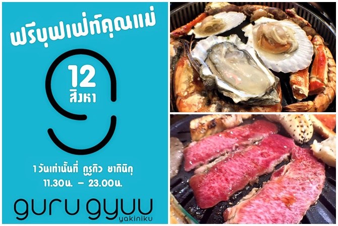 จัดหนักจัดเต็มกับบุฟเฟ่ต์ปิ้งย่างขั้นเทพกูรูกิว (Guru Gyuu) เฉพาะวันศุกร์ที่ 12 สิงหาคม 2559 โต๊ะไหนที่มาทานบุฟเฟ่ต์ตั้งแต่ 3 ท่าน (ผู้ใหญ่) ขึ้นไป ฟรีบุฟเฟ่ต์คุณแม่ (สูงสุดได้ไม่เกิน 1 ท่าน) มาทานไม่ถึง 3 ท่าน (ผู้ใหญ่) คุณแม่รับส่วนลดราคาบุฟเฟ่ท์ 50% เฉพาะบุฟเฟ่ท์ราคา 444.-/555.-/1,555.- เท่านั้น