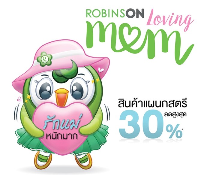 โรบินสัน จัดแคมเปญ RobinsOn Loving MOM จนถึงวันที่ 14 สิงหาคม เพื่อต้อนรับเทศกาลวันแม่ ให้ลูกมาจับจ่ายใช้สอยสินค้า ในกลุ่มสินค้าสตรี ความงาม และสินค้าตกแต่งบ้านแบรนด์ดังคอลเลกชันล่าสุดกับ 12 Great Things to Please Your Mom ทั้งยังมอบส่วนลดสูงสุด 30%
