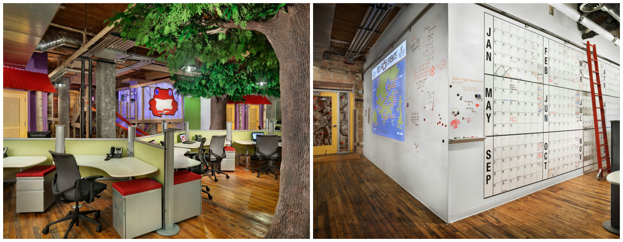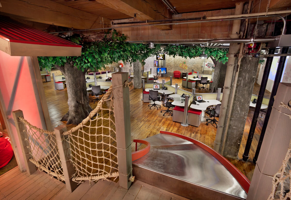 Red Frog Events คือบริษัทที่จัดอีเว้นท์ในสเกลขนาดใหญ่ มีสำนักงานใหญ่อยู่ในมหานครชิคาโก ประเทศสหรัฐอเมริกา ออฟฟิศแห่งนี้จะเรียกความสดใสของคุณกลับคืนมา เพราะพวกเขามีสไลเดอร์ ต้นไม้กลางออฟฟิศ และมุมนั่งเล่นน่ารักๆให้พนักงานได้คุยกัน ถ้าเกิดคุณคิดงานไม่ออกมาพักใหญ่ ลองไปเล่นสไลเดอร์ดูสักสองสามรอบ ไอเดียอาจจะโลดแล่นขึ้นมาก็เป็นได้