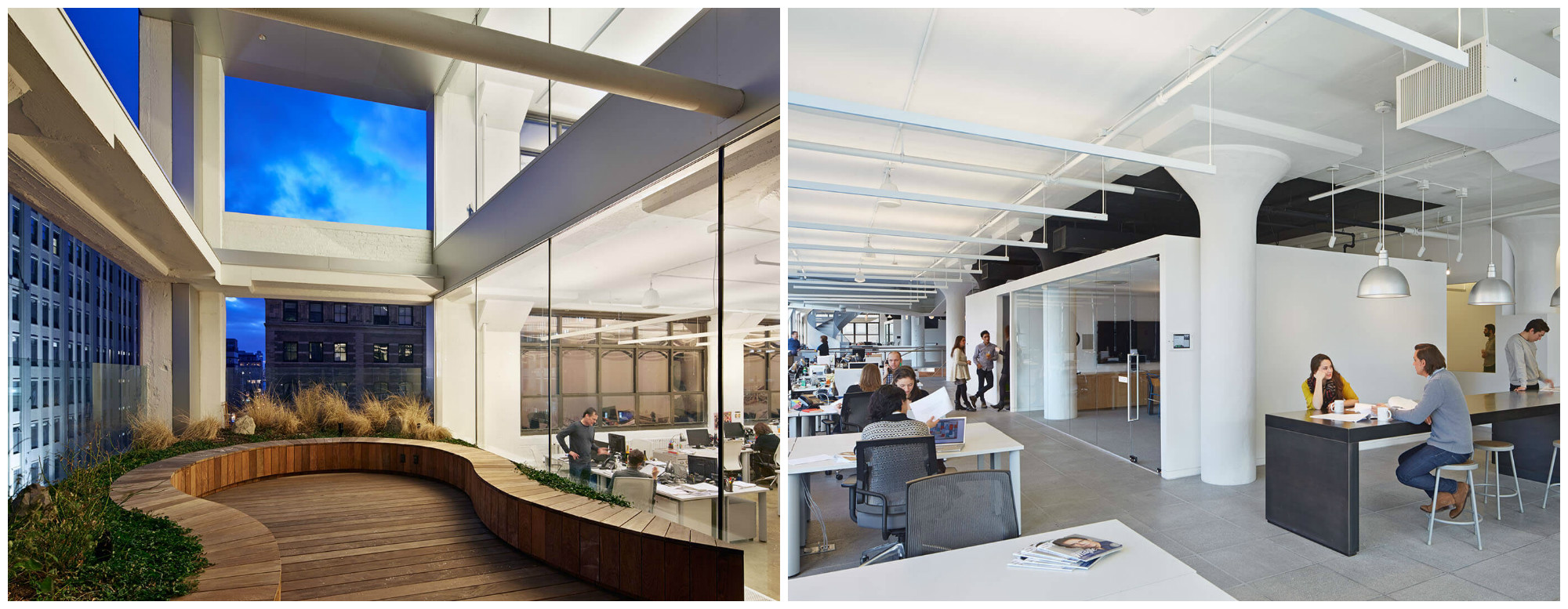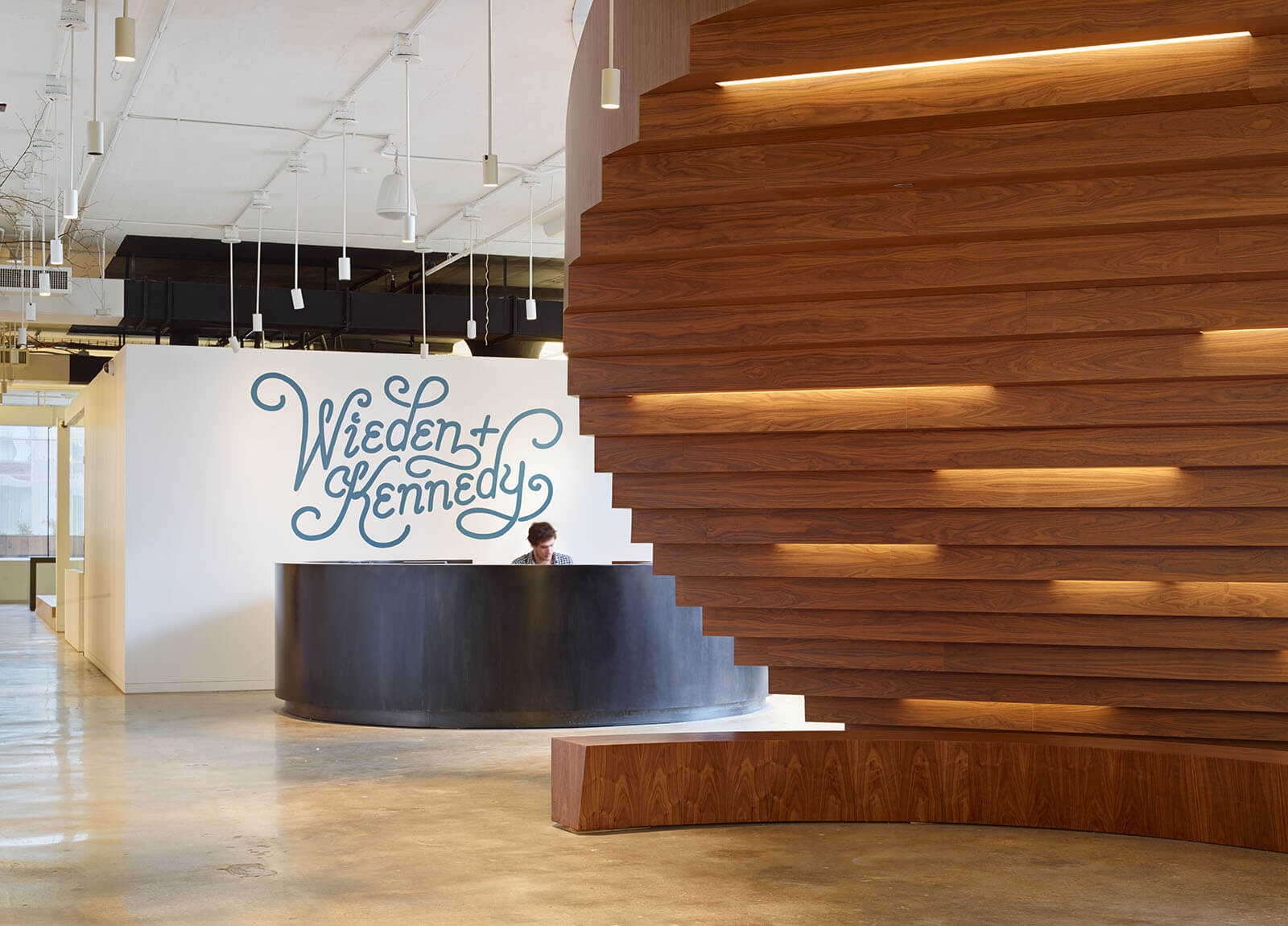 Wieden+Kennedy คือบริษัทเอเจนซีโฆษณาผู้เป็นส่วนหนึ่งในการประสบความสำเร็จของ Nike โต๊ะทำงานและพื้นที่ต่างๆในออฟฟิศถูกดีไซน์ให้เป็นลักษณะเปิด เพื่อการประสานงานกันอย่างมีประสิทธิภาพระหว่างทีม บันไดของพวกเขาถือว่าเป็นจุดหนึ่งที่หน้าสนใจ ดีไซน์ของมันให้ความรู้สึกโปร่งโล่งและดูสบายตา อีกทั้งพวกเขายังมีสวนซึ่งอยู่ชั้นบนให้พนักงานได้ผ่อนคลายกับธรรมชาติ ท่ามกลางความวุ่นวายของผู้คนในมหานครนิวยอร์ก