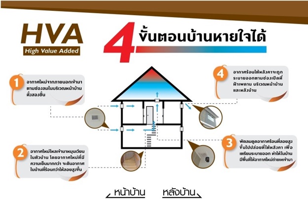 รวมไปถึงการออกแบบแนวคิดบ้านหายใจได้ หรือออกแบบระบบไหลเวียนอากาศภายในบ้าน โดยใช้แนวคิดการดึงอากาศบริสุทธิ์จากภายนอกเข้าสู่ตัวบ้าน ทำให้อากาศภายในบ้านถ่ายเทได้ดีขึ้น ส่งผลให้ความร้อนในตัวบ้านลดลง ทั้งยังช่วยประหยัดไฟจากการใช้เครื่องปรับอากาศ