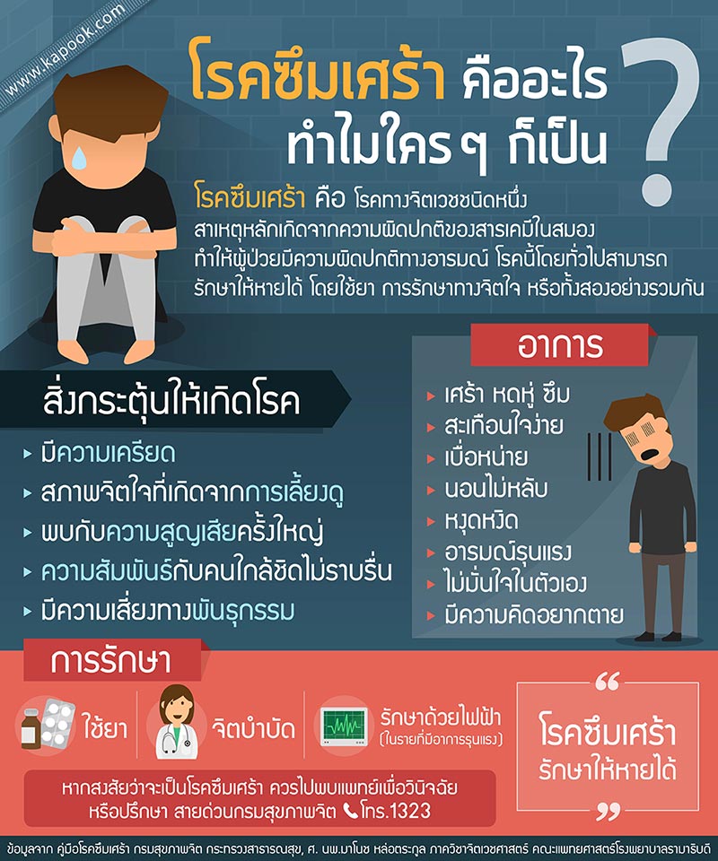 โรคซึมเศร้า เป็นโรคที่รู้จักกันอย่างแพร่หลายในปัจจุบัน เนื่องจากในช่วงเวลาไม่กี่ปีที่ผ่านมา มีคนดังทั้งในและต่างประเทศจบชีวิตตนเองกันหลายคน ด้วยสาเหตุเพราะโรคซึมเศร้านี้ เมื่อก่อนหากได้ยินชื่อ โรคซึมเศร้า คงสงสัยและไม่เข้าใจว่ามันเกิดจากอะไร ทำไมถึงสามารถทำให้คนเราคิดฆ่าตัวตายได้