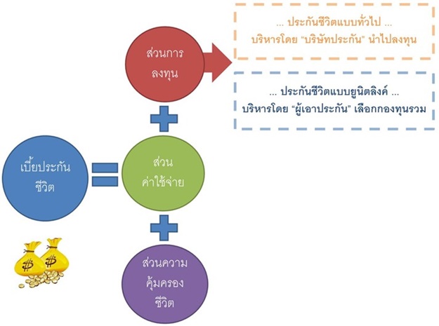 ก่อนอื่นอยากให้ทำความเข้าใจโครงสร้างของประกันชีวิตก่อนว่า ไม่ว่าจะเป็นประกันชีวิตแบบไหนก็ตาม เบี้ยประกันที่เราจ่ายไปจะแบ่งเป็น 3 ส่วนคือ (1) ส่วนของความคุ้มครองชีวิต (2) ส่วนของค่าใช้จ่ายและค่าธรรมเนียมตามกรมธรรม์ และ (3) ส่วนของเงินลงทุนในสินทรัพย์ต่างๆ