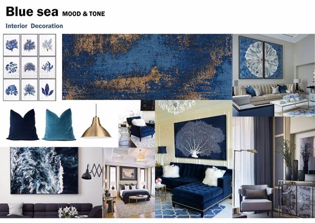 มุมนั่งเล่นมีชุดโซฟา พรม วอลเปเปอร์และภาพตกแต่งคุมโทนสีน้ำเงิน ตามธีม Blue Sea
