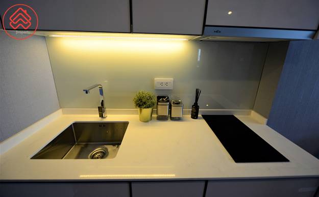 ถัดไปจะเป็นมุมครัว มีท็อปครัวขนาดใหญ่ มีบิ้วท์อินเก็บของด้านบน โดยมาพร้อมกับเตาไฟฟ้า ที่ดูดควันและซิงค์ล้างจาน