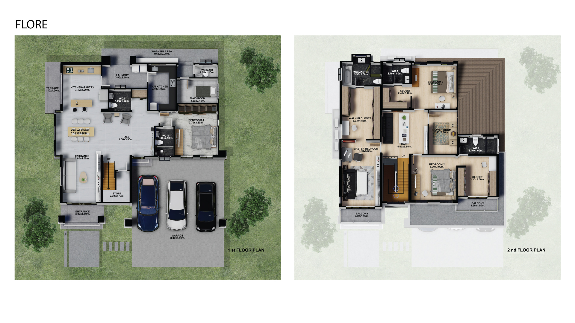 FLORE ฟังก์ชั่น 4 ห้องนอน 5 ห้องน้ำ 3 ที่จอดรถ พื้นที่ใช้สอย 390.88-404.96 ตร.ม. ขนาดที่ดิน 114-186.40 ตร.วา
