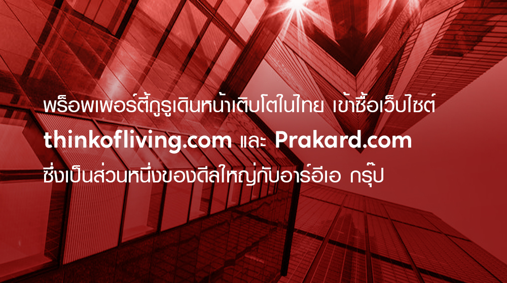 เรามีความยินดีอย่างยิ่งที่จะแจ้งให้ท่านทราบว่าวันนี้ พร็อพเพอร์ตี้กูรูกรุ๊ป กลุ่มบริษัทด้านเทคโนโลยีอสังหาริมทรัพย์ชั้นนำของเอเชียและเป็นบริษัทแม่ของดีดีพร็อพเพอร์ตี้ เว็บไซต์มาร์เก็ตเพลสด้านอสังหาริมทรัพย์อันดับหนึ่งในประเทศไทย จะเข้าซื้อสินทรัพย์ด้านเทคโนโลยีทั้งหมดของอาร์อีเอ กรุ๊ป (REA Group) ในประเทศไทยและมาเลเซีย ซึ่งประกอบด้วย thinkofliving.com และ Prakard.com ในประเทศไทย และ iProperty.com.my และ brickz.my ในประเทศมาเลเซีย