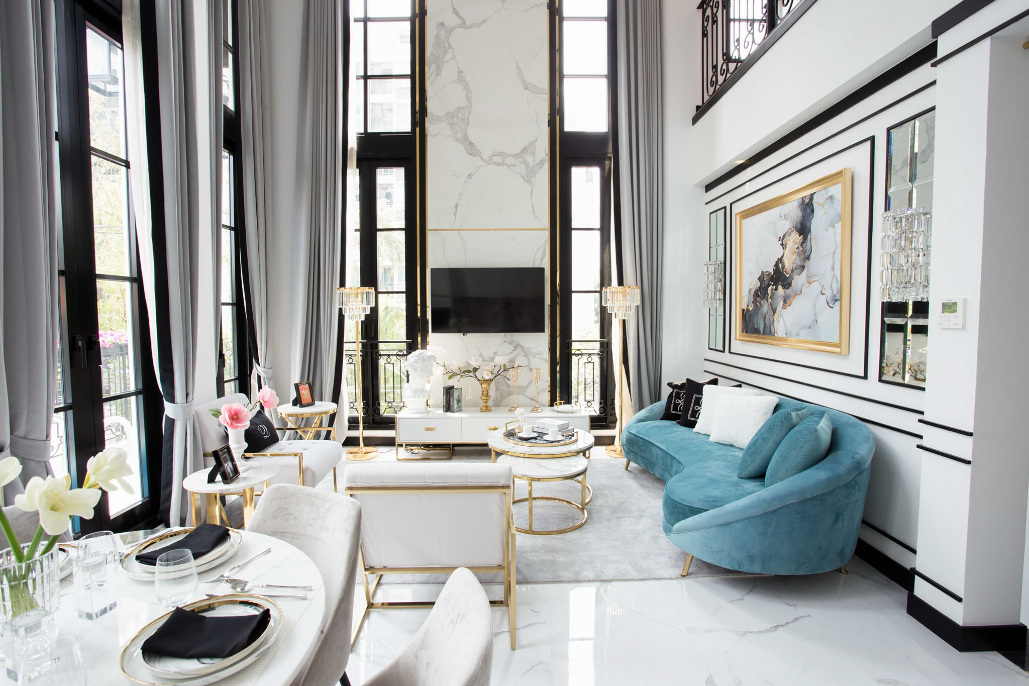 มาพร้อมลิฟต์ส่วนตัว ห้องโถงขนาดใหญ่สูงถึง 5.5 เมตร หน้าต่างสไตล์ฝรั่งเศสสูงจากพื้นจรดเพดาน สระว่ายน้ำริมระเบียง วัสดุระดับพรีเมียมทั้งหินอ่อน และคริสตัล เน้นการใช้สีทองให้ความลักซ์ชัวรี และเพิ่มเสน่ห์ให้บ้านด้วยบันไดวนที่ดูโดดเด่นล้ำสมัย