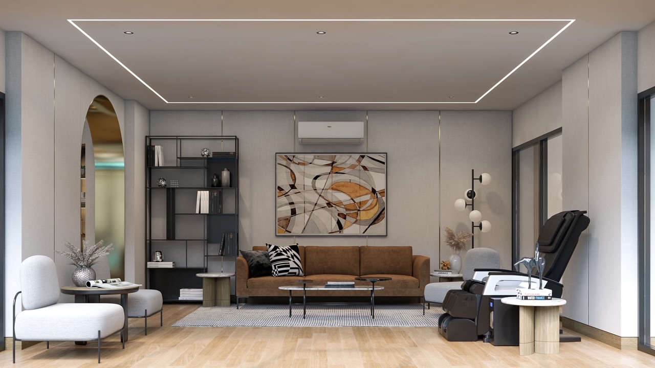 - Relax Space ตกแต่งด้วยสไตล์คอนเทมโพรารีสีน้ำตาลกับสีเทาทำให้บรรยากาศดูอบอุ่น สบายตา เหมาะสำหรับการหยุดพักผ่อน