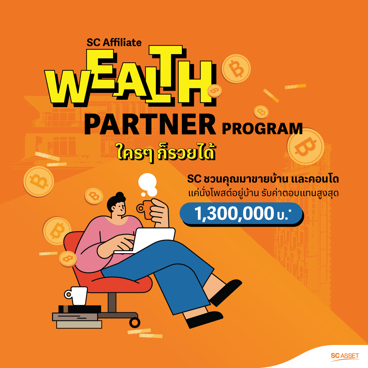 ภายใต้แคมเปญ SC Affiliate “Wealth Partner Program” ใคร ๆ ก็รวยได้ ชวนทุกคนมาเป็นตัวแทนขายบ้านเเละคอนโดของ SC Asset ได้ง่าย ๆ พร้อมรับค่าตอบเเทนสูงสุดถึง 1,300,000 บาท* ตั้งแต่วันที่ 1 พฤษภาคม-30 กันยายน 2567