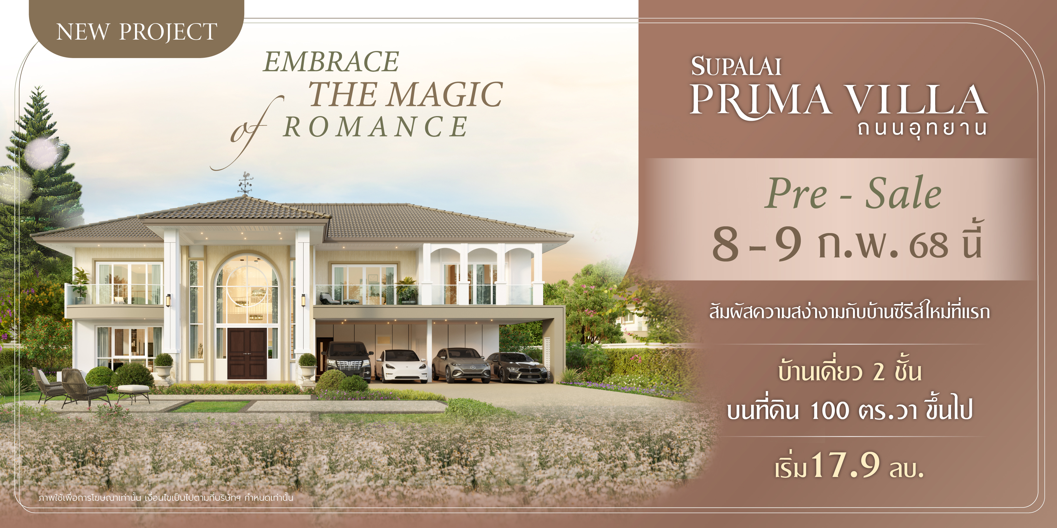 [PR News] ศุภาลัย เปิดโครงการสุดลักซ์ชัวรี “ศุภาลัย พรีมา วิลล่า ถนนอุทยาน” บ้านเดี่ยว 2 ชั้น ซีรีส์ล่าสุด Romantic Charm บนที่ดิน 100 ตารางวาขึ้นไป ในสังคมสุดไพรเวตเพียง 65 ยูนิต พร้อมโซลาร์เซลล์ทุกหลัง พื้นที่ใช้สอย 344-502 ตารางเมตร ราคาเริ่มต้น 17.9 ล้านบาท Pre-Sales 8-9 ก.พ.นี้