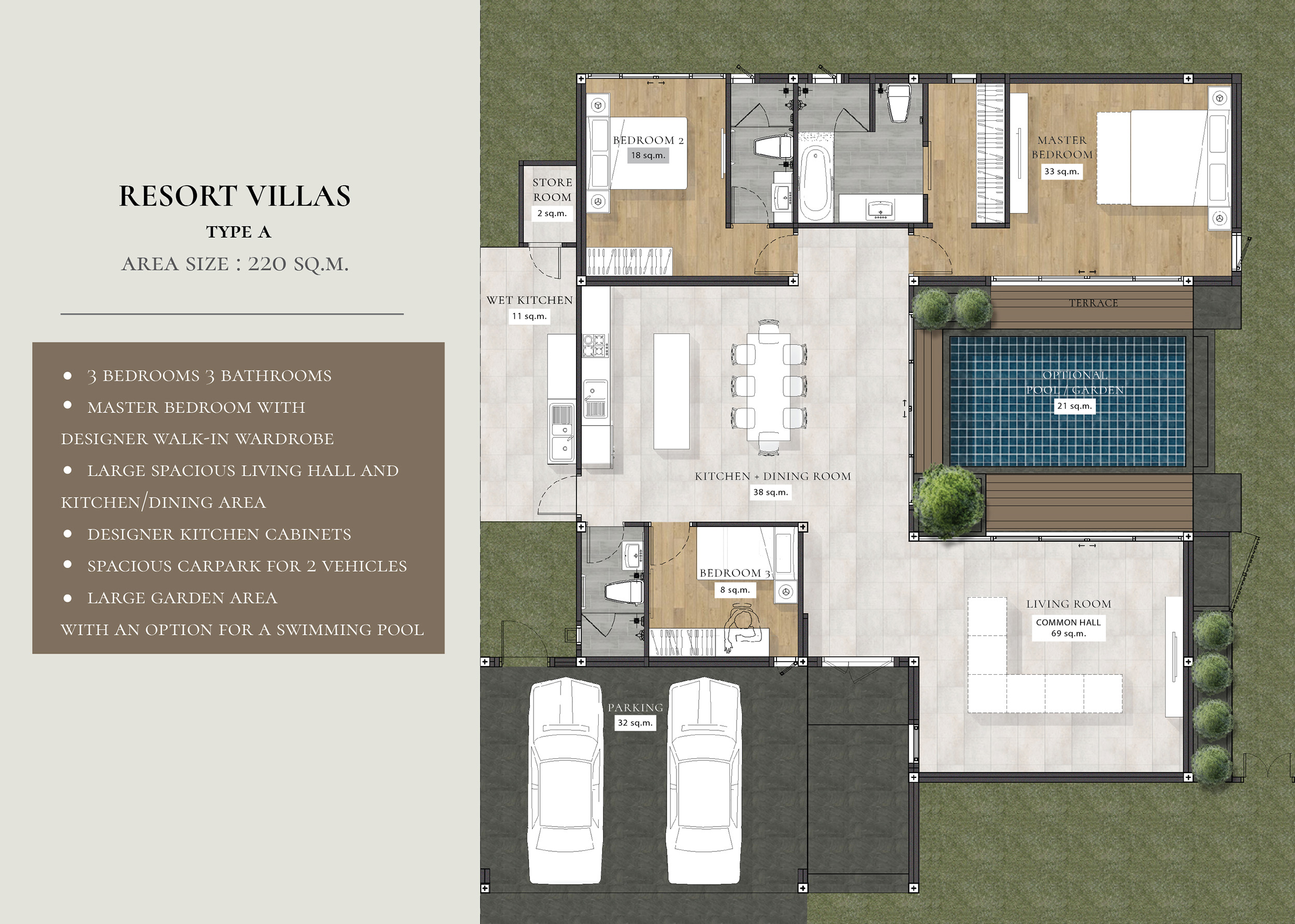 – พื้นที่ใช้สอย 220 ตรม., ขนาดที่ดินเริ่มต้นที่ 100.9 ตรว.