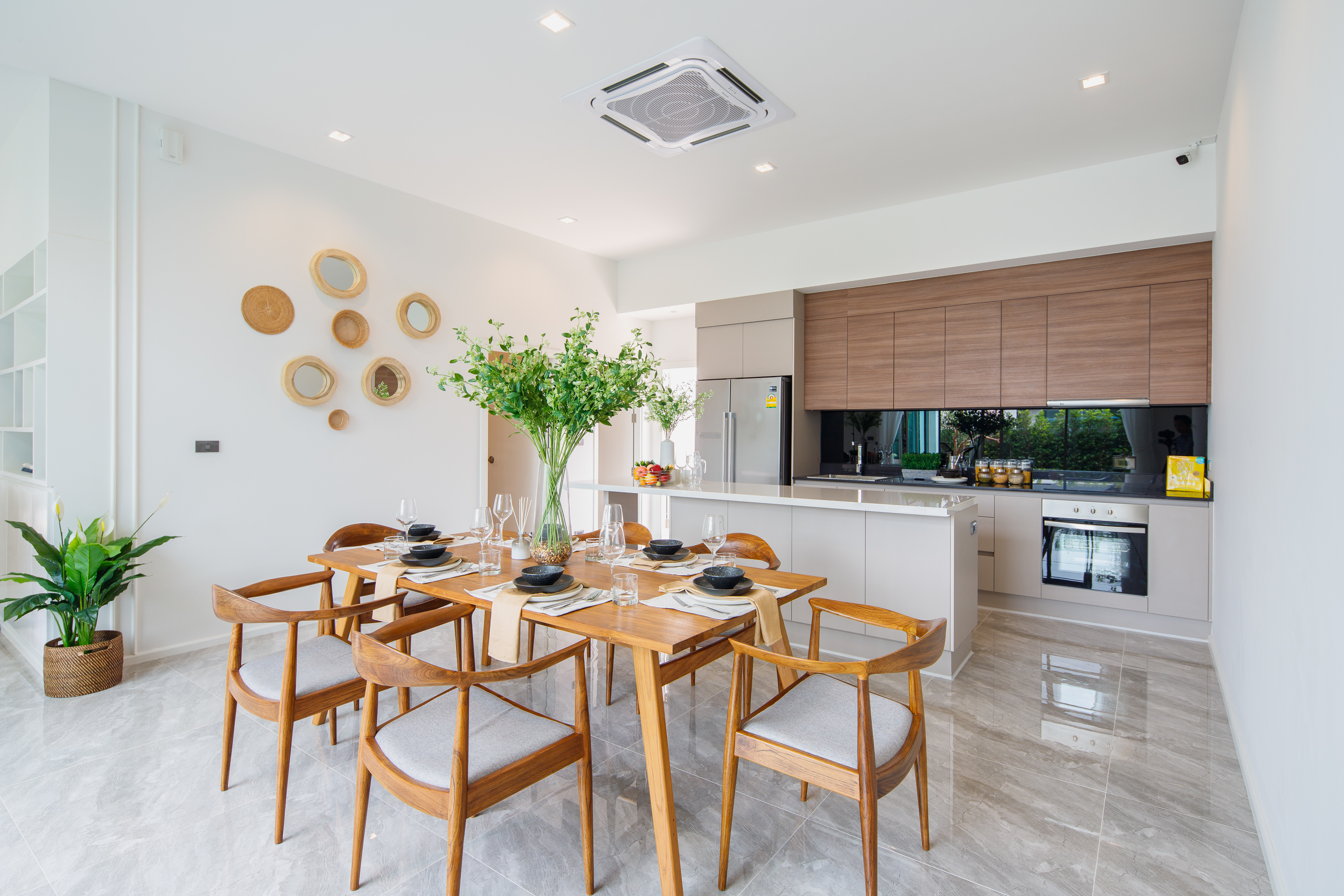 พื้นที่กว้างขวางสำหรับห้องรับแขกและห้องรับประทานอาหาร ห้องครัวมาพร้อมกับเตาไฟฟ้า เครื่องดูดควัน และอ่างล้างจาน