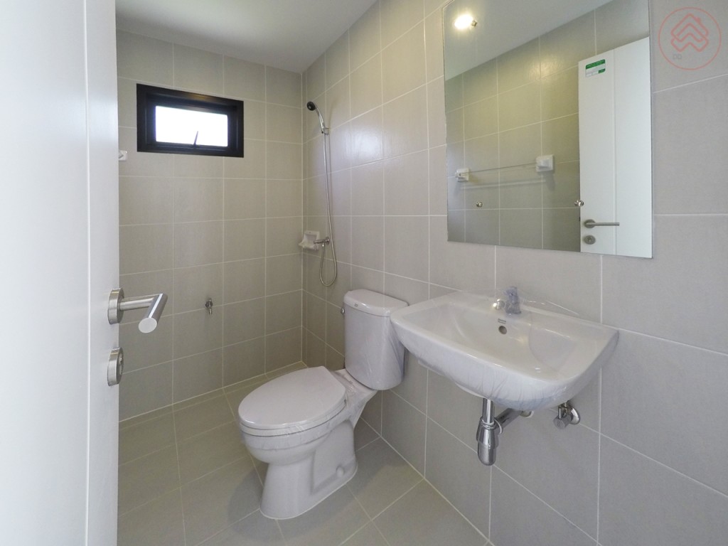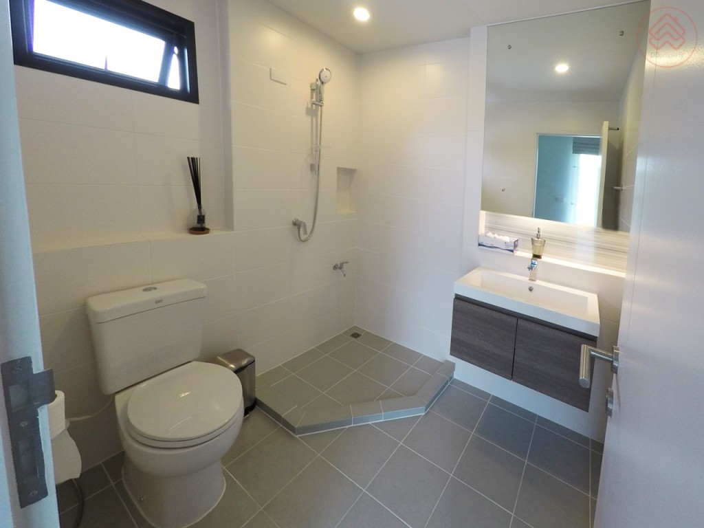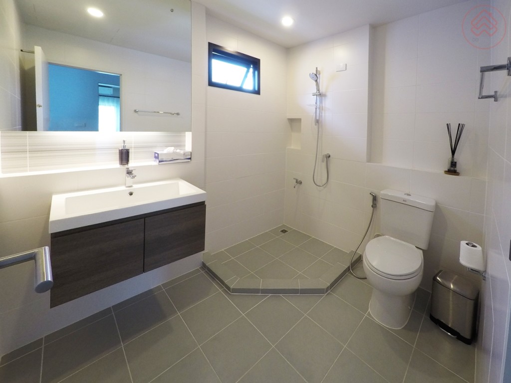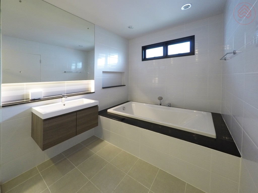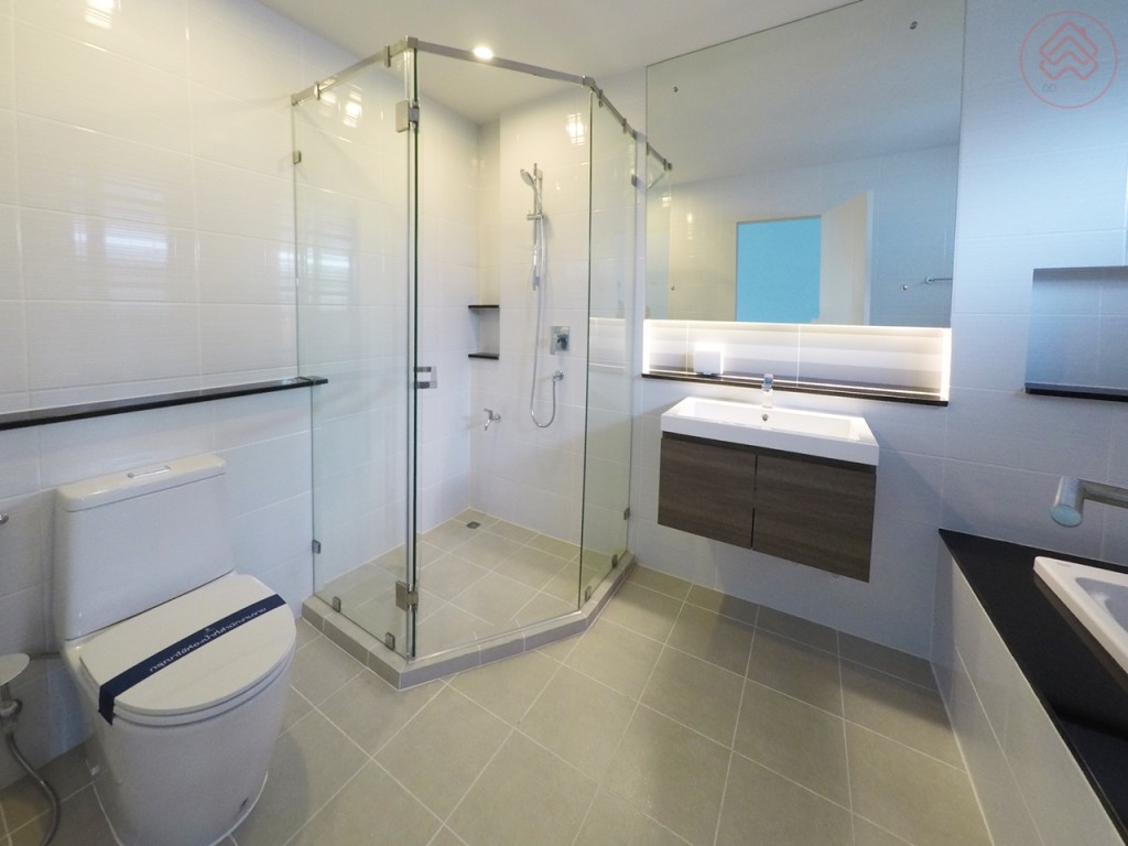 ห้องน้ำภายในห้องนอนใหญ่ มีการแบ่งโซนแห้ง และ โซนเปียกอย่างชัดเจน มีบิ้วอินตู้อ่างล้างมือ และกระจกเงาบานใหญ่ให้ด้วย พื้นที่อาบน้ำที่มีการกั้นขอบเอาไว้สามารถกั้นกระจกเป็นห้องอาบน้ำเพิ่มได้