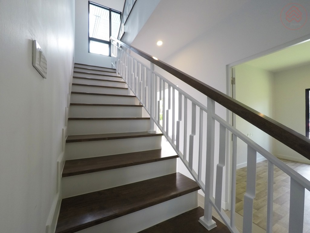 บันได: วัสดุหลักเป็นเหล็กกล่องทาสีขาว ราวจับเป็นไม้ พื้นไม้ลามิเนต สีน้ำตาลเข้ม