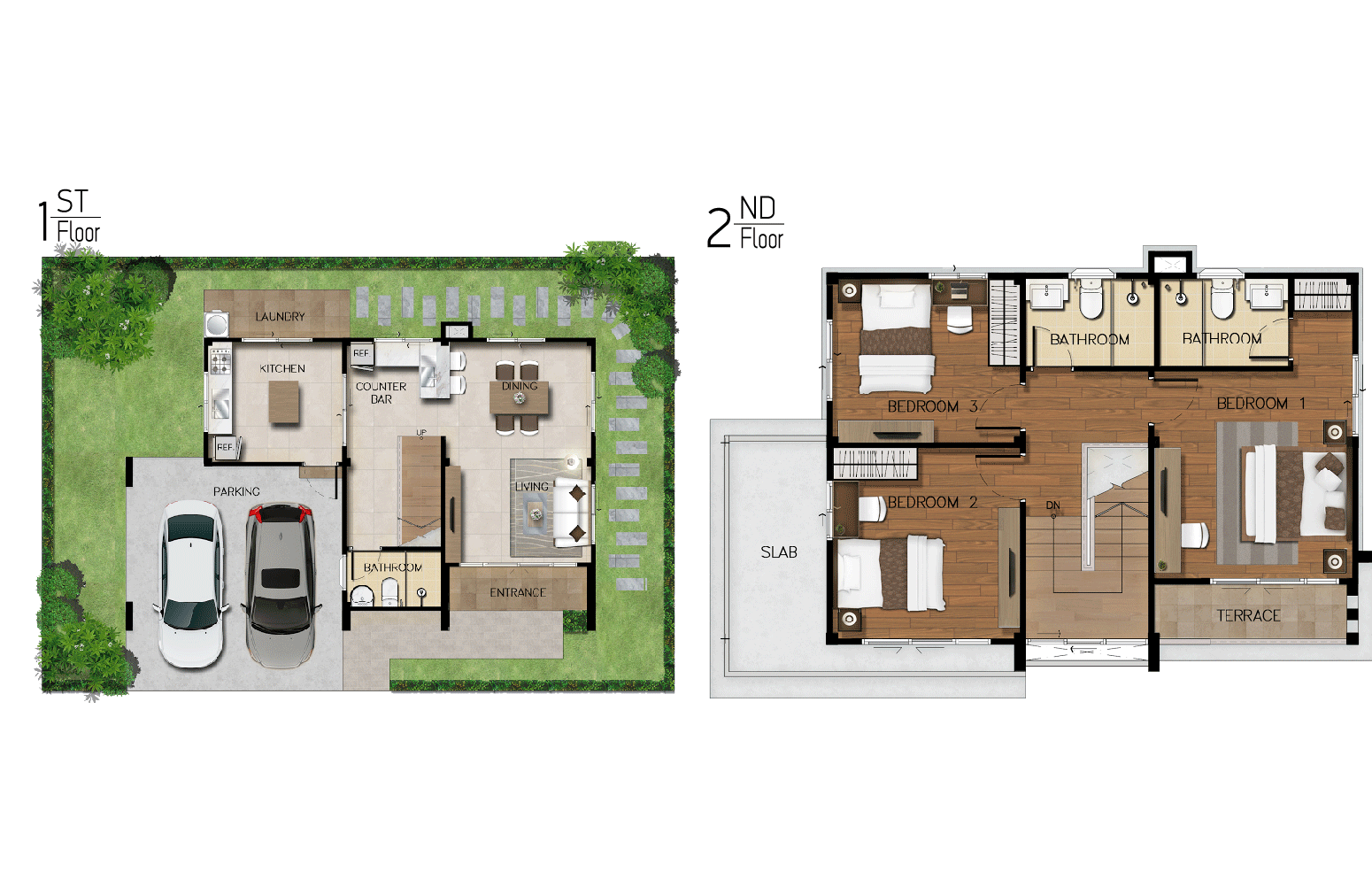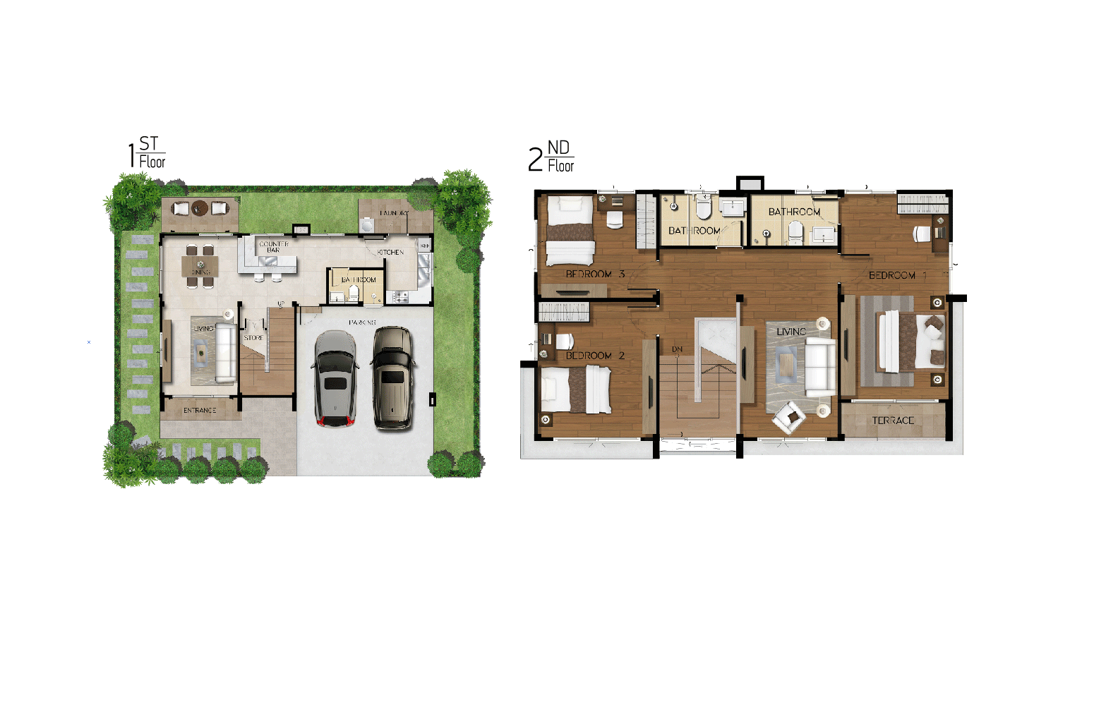 แบบบ้าน Type B มีพื้นที่ใช้สอย 180 ตร.ม. ประกอบด้วย 3 ห้องนอน 3 ห้องน้ำ 2 ห้องรับแขก 1 ห้องครัว แยกเป็นสัดส่วน พร้อมพื้นที่รับประทานอาหารแยกส่วน รองรับ Counter Bar และ 2 ที่จอดรถ