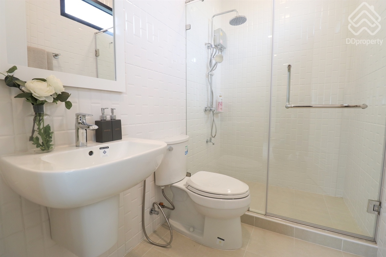 สำหรับห้องน้ำด้านล่าง เน้นใช้โทนสีโทนสว่าง โดยภายในห้องอาบน้ำมีการกั้นโซนเปียก-แห้งด้วยพื้นต่างระดับ และทางโครงการเลือกใช้สุขภัณฑ์แบรนด์ Kohler ที่มาพร้อมอ่างล้างหน้าและกระจกบานใหญ่