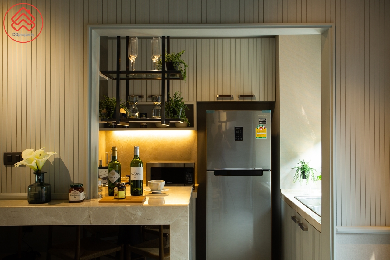 เข้ามาภายในบ้านจะเป็นห้องนั่งเล่นเชื่อมต่อแบบเปิดโล่งกับห้องรับประทานอาหาร และห้องครัว