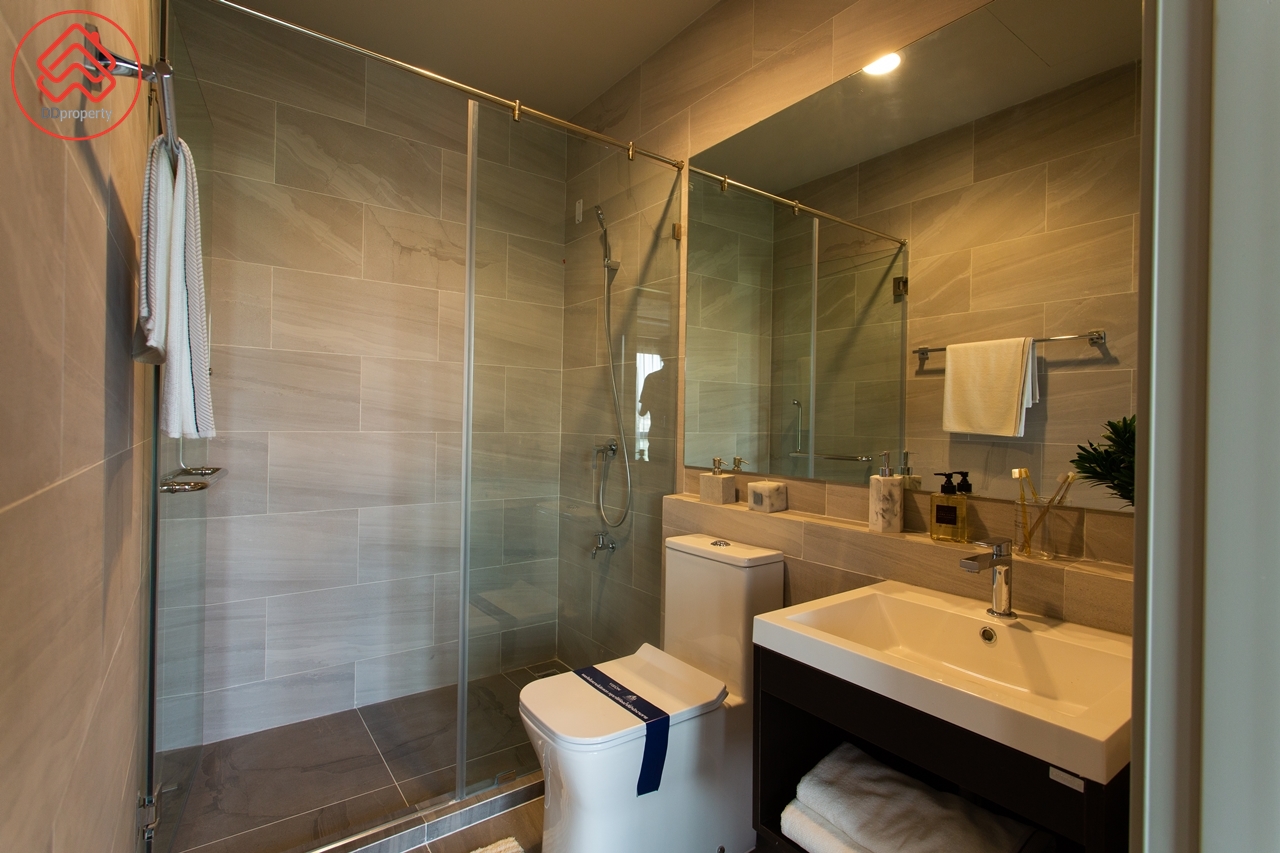 ห้องน้ำบริเวณชั้นที่ 2 อุปกรณ์ครบครัน พร้อมประตูกระจกกั้นพื้นที่อาบน้ำเป็นสัดส่วน