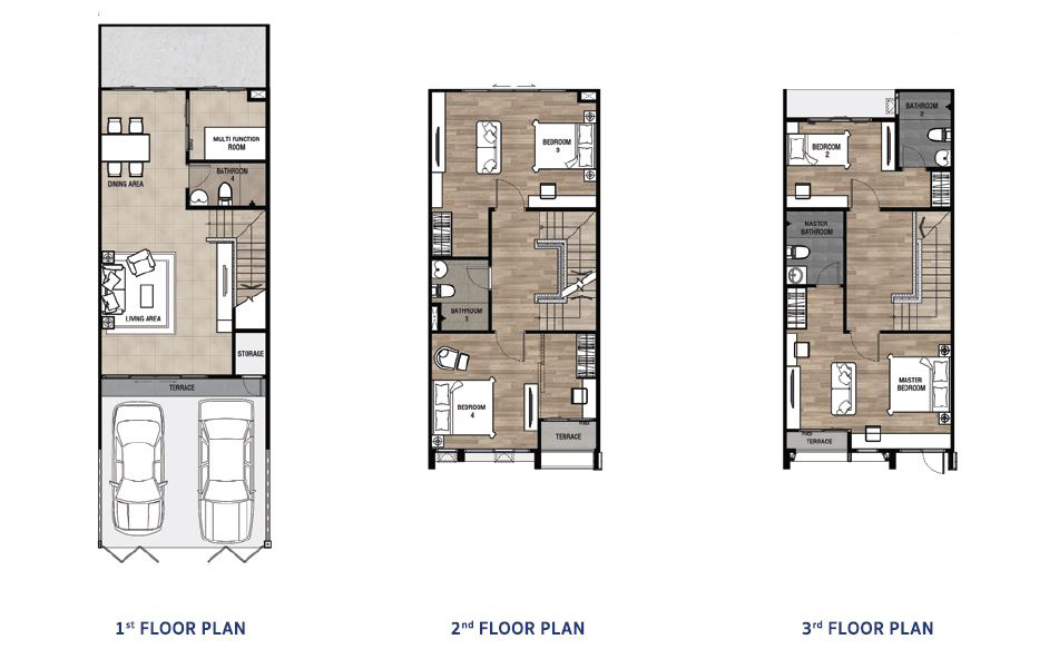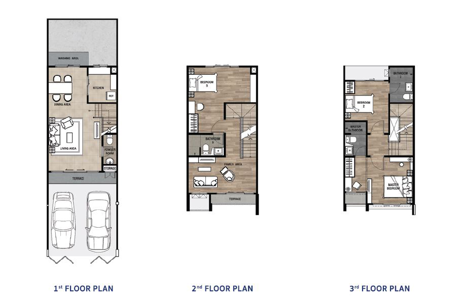 ทาวน์โฮม 3 ชั้น พื้นที่ใช้สอย 190 ตารางเมตร ขนาด 3 ห้องนอน 4 ห้องน้ำ (พร้อมพื้นที่อาบน้ำทุกห้อง) 1 ห้องรับแขก 1 ห้องอเนกประสงค์ ส่วนเตรียมอาหาร โซนรับประทานอาหาร จอดรถได้ 2 คัน