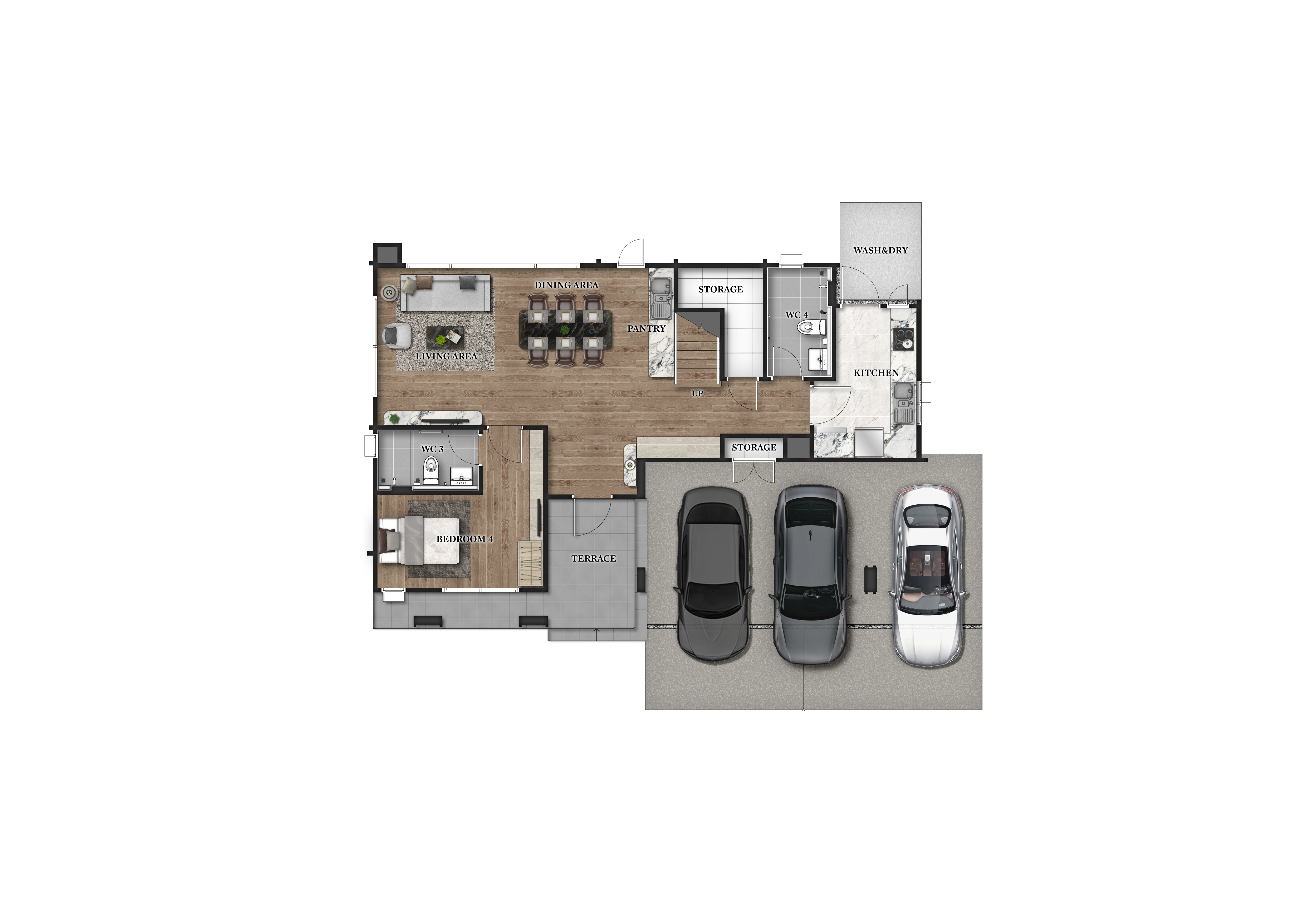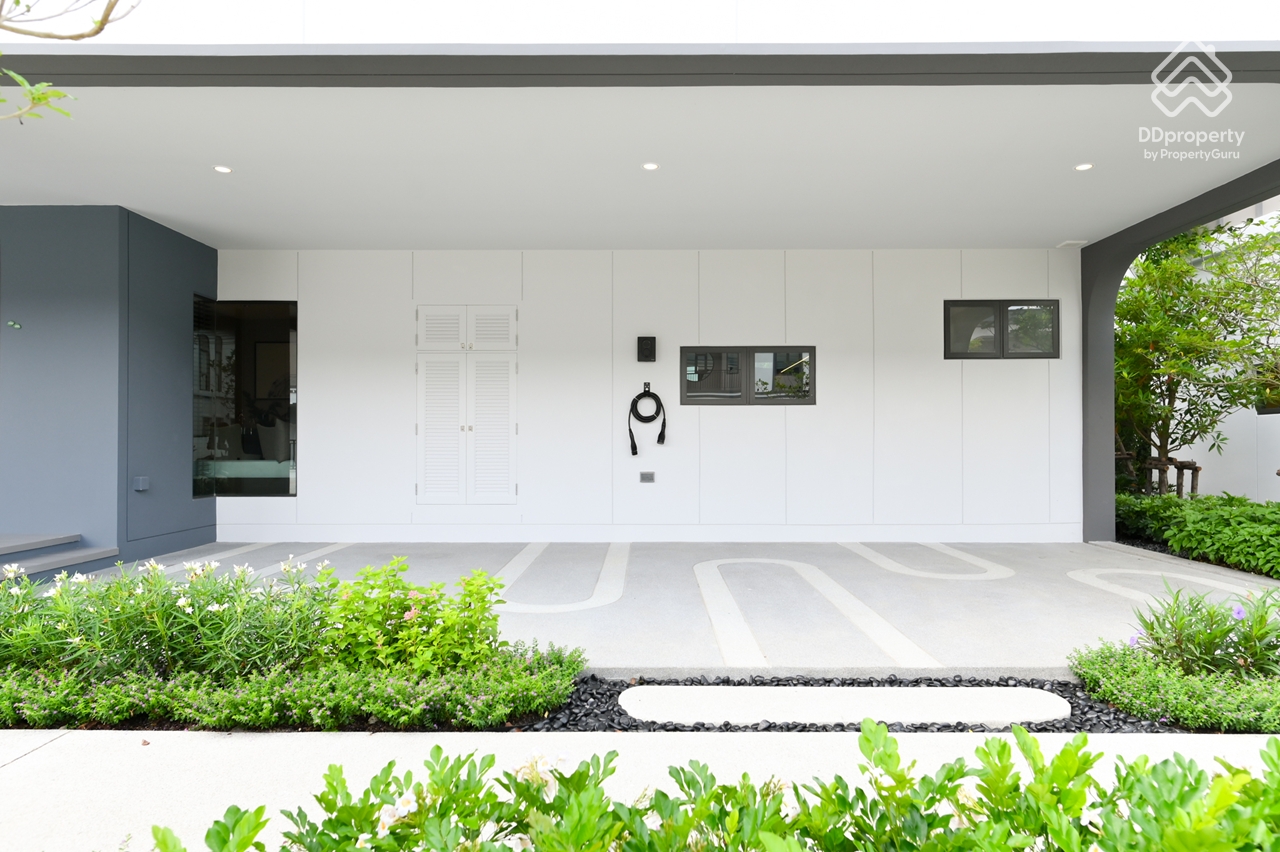 พื้นที่จอดรถกว้างขวาง รองรับการจอดรถได้ถึง 3 คัน พร้อมเตรียมจุดรองรับสำหรับติดตั้ง EV Charger มาให้ด้วย และด้านหลังของพื้นที่จอดรถยังมีห้องเก็บของที่แยกเป็นสัดส่วน