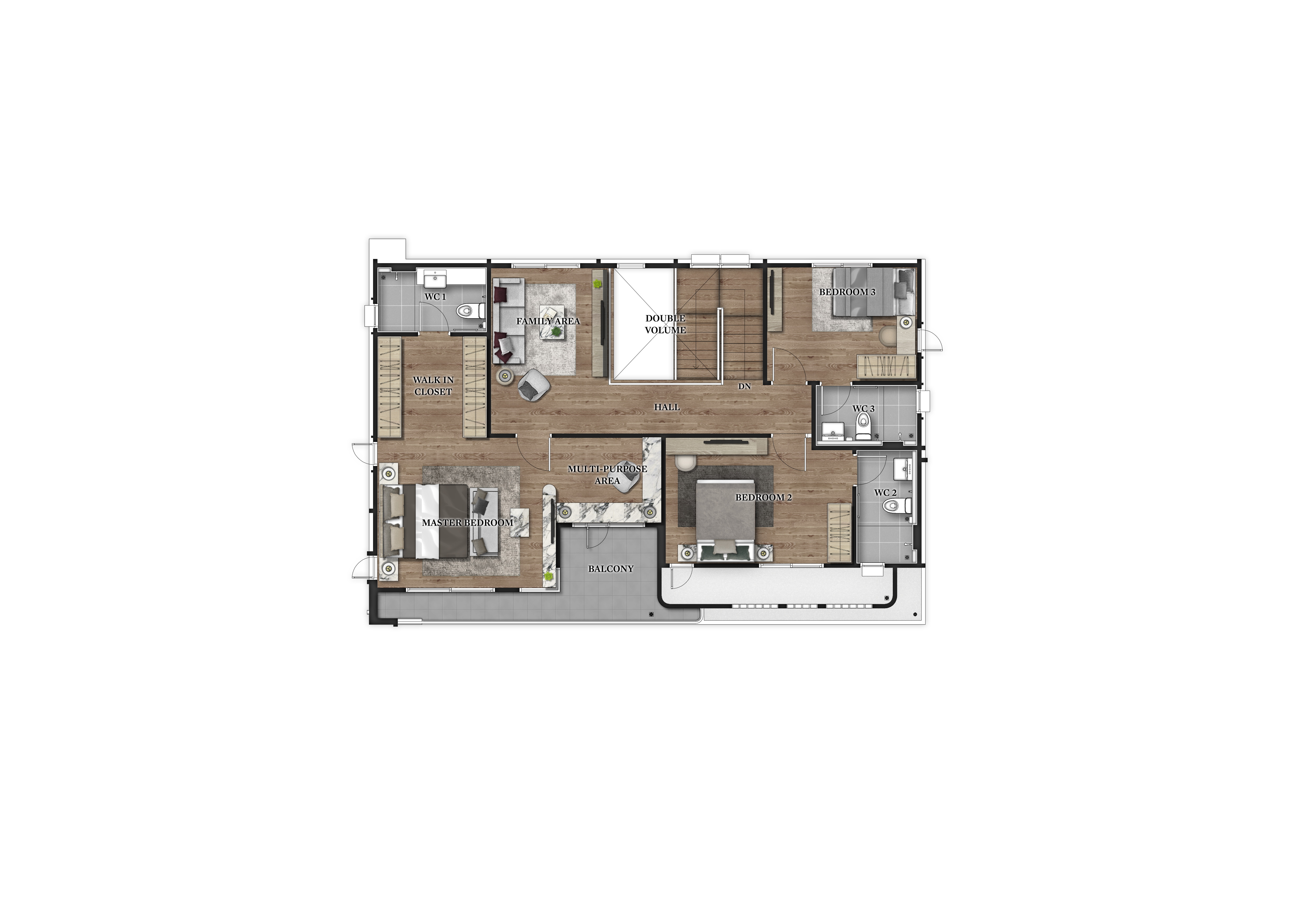 ตรงข้ามห้องนอนเล็กห้องที่ 1 จะเป็นโถงทางเดินเชื่อมระหว่าง ห้องนอนเล็กห้องที่ 2 Master Bedroom และ Family Area