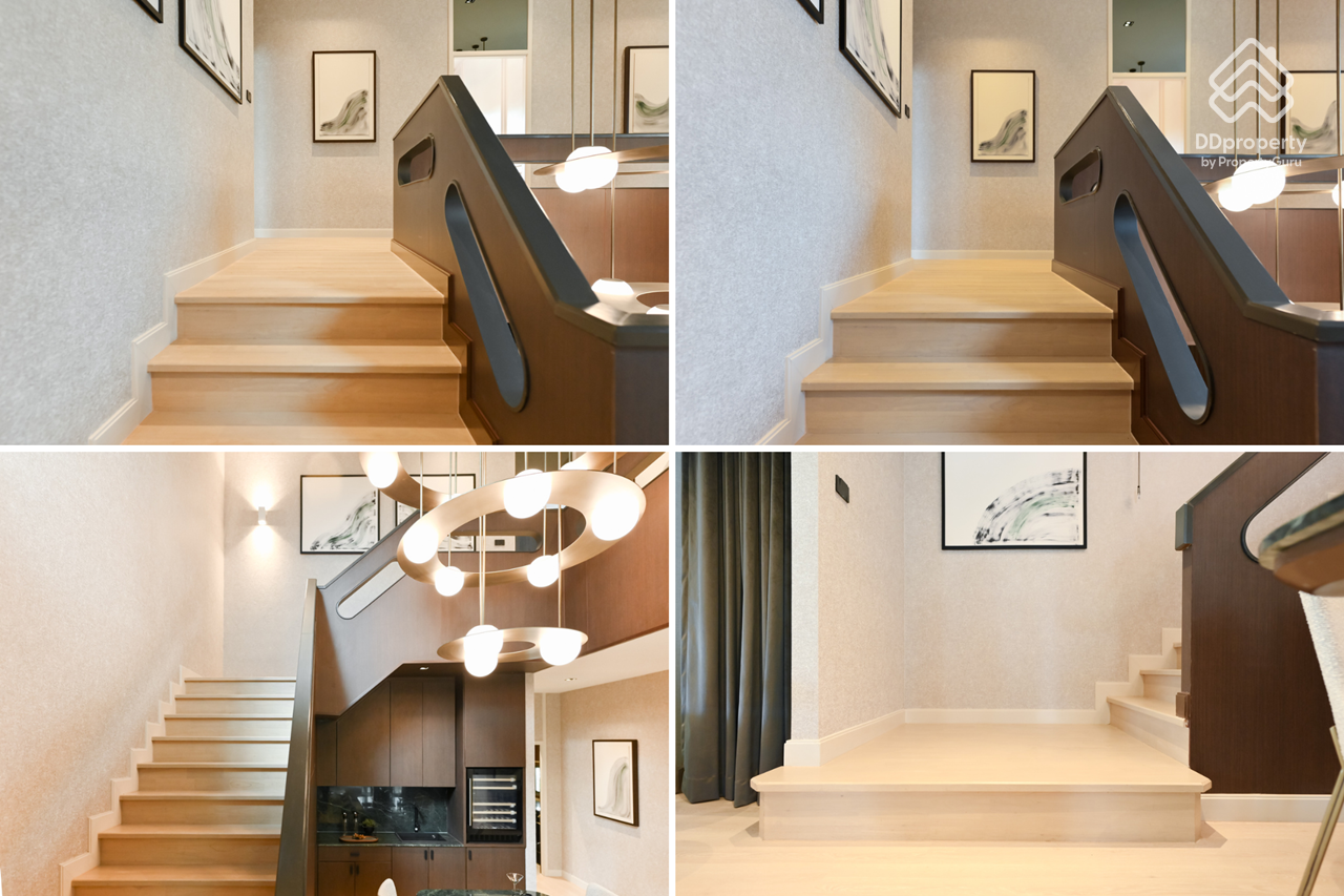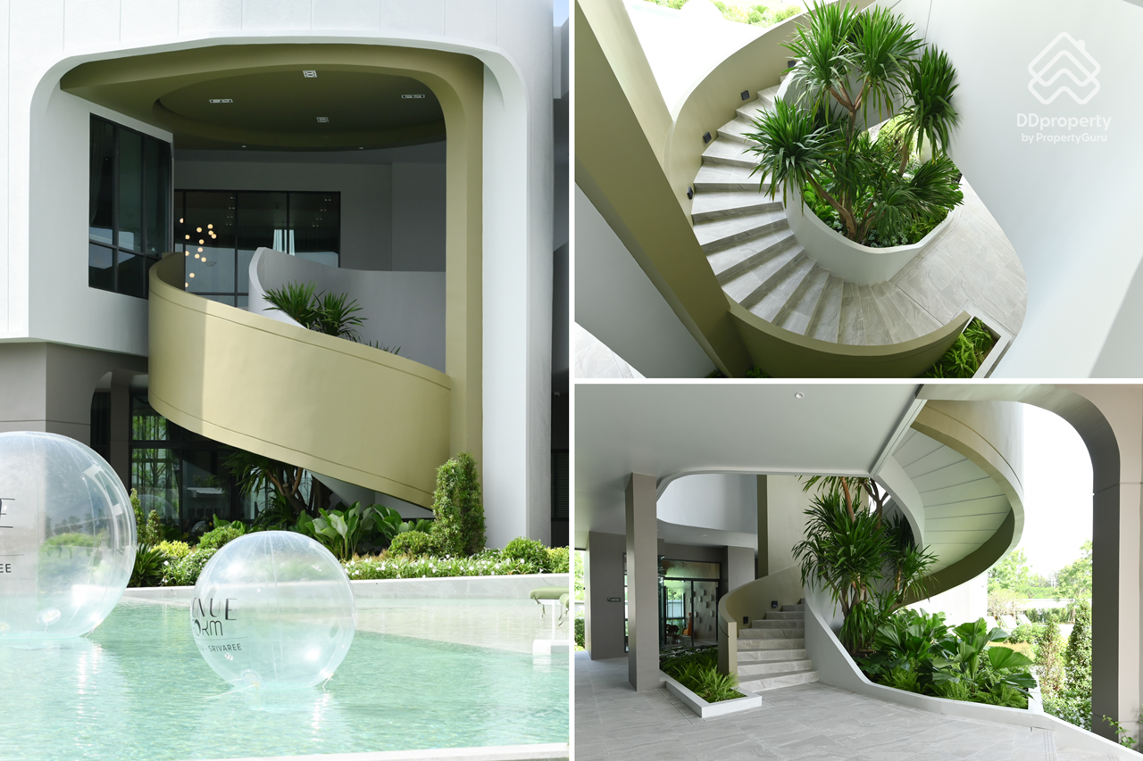 โถงบันไดถูกออกแบบให้โปร่งโล่ง มีเอกลักษณ์เฉพาะตัวที่แตกต่างจากโครงการอื่น ๆ โครงสร้างหลักทำจากคอนกรีตเสริมเหล็ก แข็งแรงทนทาน ส่วนลูกตั้งและลูกนอนปูด้วยไม้สักคุณภาพสูง