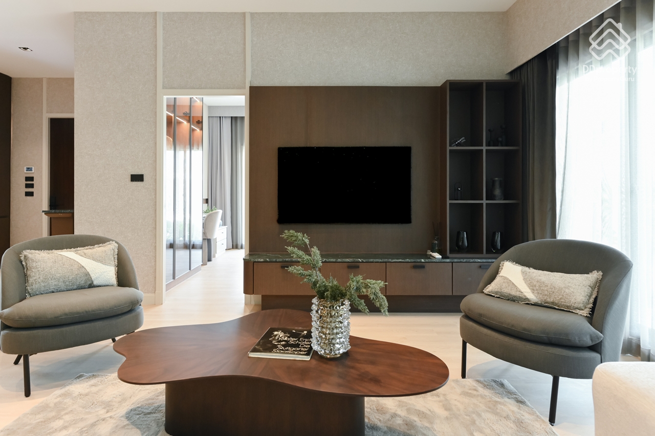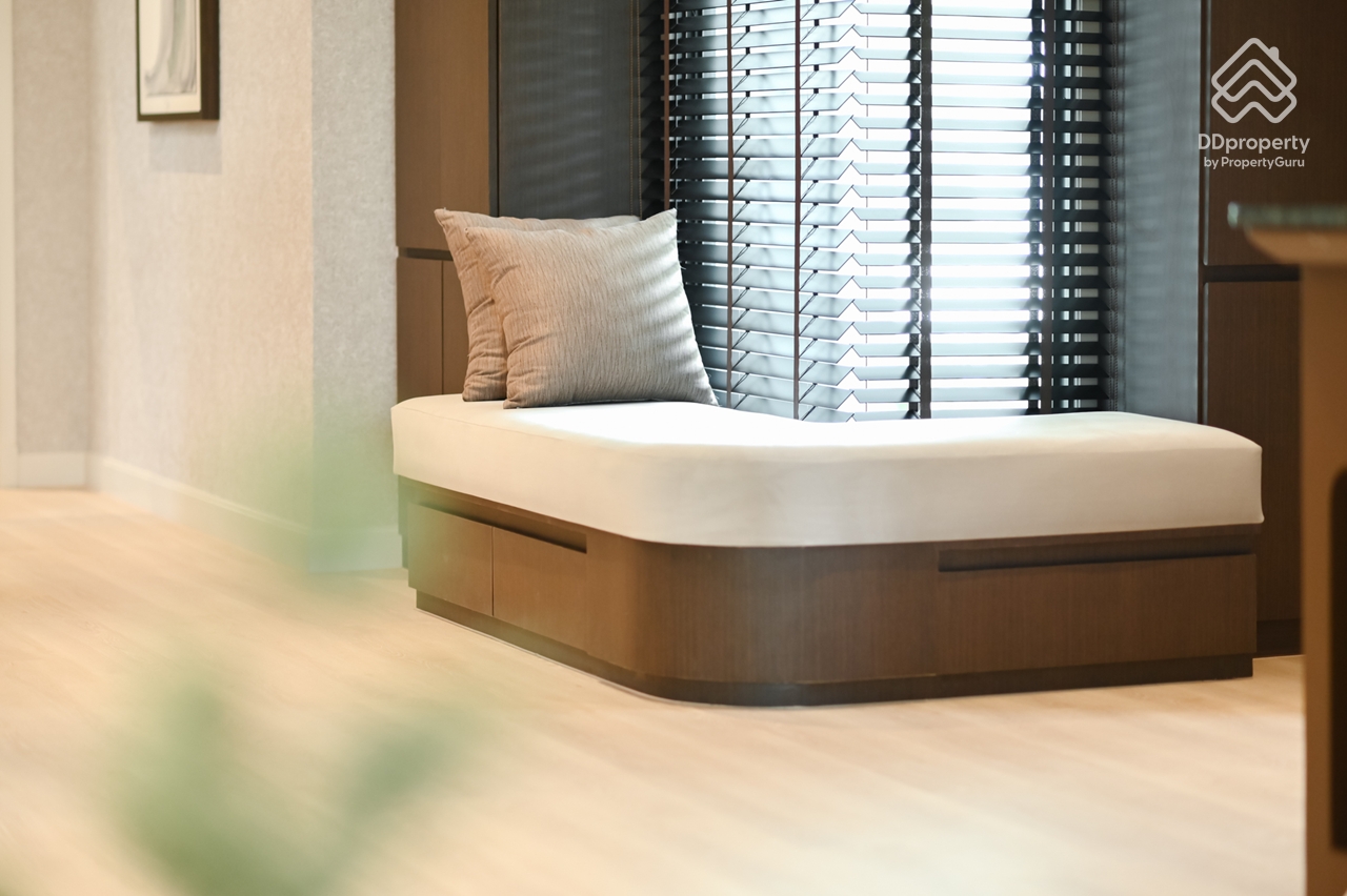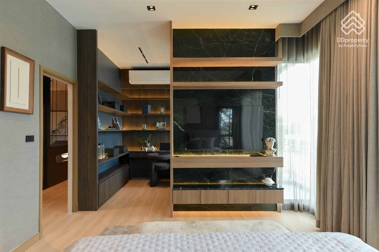 บริเวณปลายเตียงถูกออกแบบให้เป็นพื้นที่สำหรับวาง Smart TV ซึ่งอยู่ด้านหน้าพื้นที่พักผ่อน โดยสามารถกั้นเป็นห้องแยกได้ ช่วยเสริมความเป็นส่วนตัว และปรับเปลี่ยนการใช้งานได้ตามความต้องการอย่างยืดหยุ่น