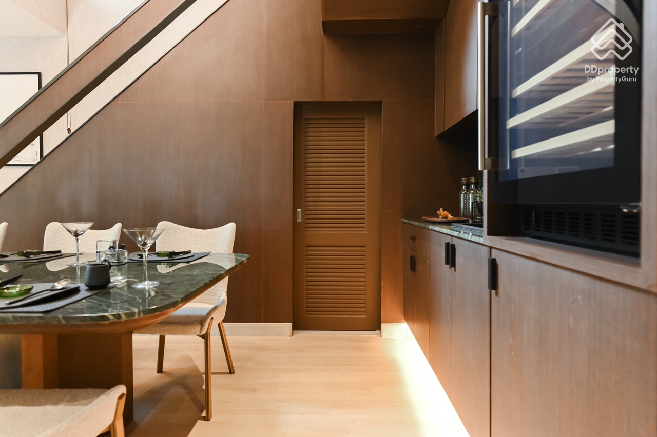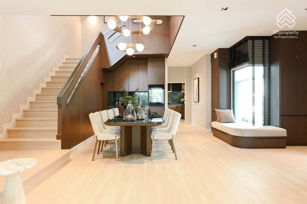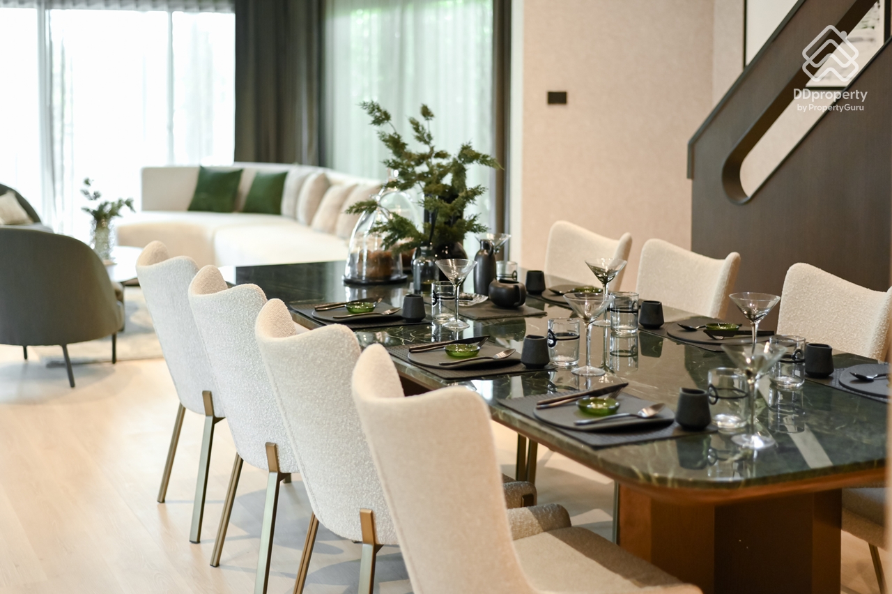 ฝั่งตรงข้ามโซน Living Area เป็นพื้นที่สำหรับ Dining Area เชื่อมต่อกับ Pantry ทำให้สามารถใช้งานได้อย่างสะดวก มาพร้อมฟังก์ชันใหม่อย่าง Vertical Form ที่ยกเพดานสูงโปร่งถึง 6 เมตร เสริมความโอ่อ่าให้กับตัวบ้าน และช่วยเชื่อมต่อพื้นที่ภายในให้ดูกว้าง โล่ง และน่าอยู่มากยิ่งขึ้น