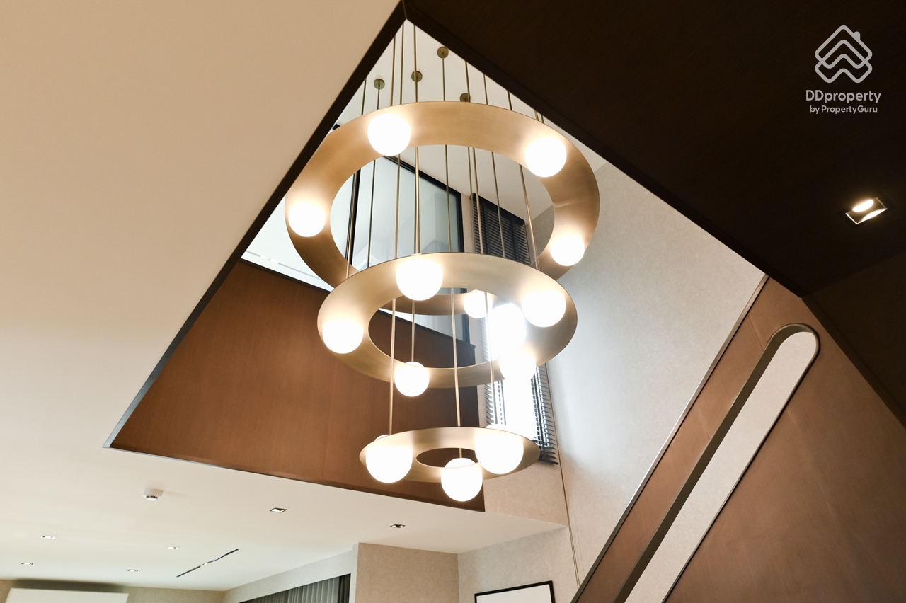 เพดานเหนือโต๊ะอาหารประดับด้วยโคมไฟแชนเดอเลียร์ เติมความหรูหราและเสริมบรรยากาศอบอุ่นให้กับตัวบ้าน