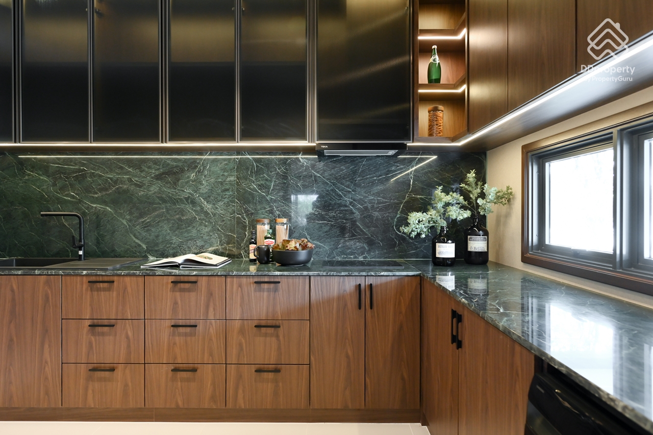 ห้องครัว ออกแบบเป็นแบบปิด มีเคาน์เตอร์รูปตัว L สำหรับทำอาหาร มีอ่างล้างจาน ด้านบนและด้านล่างออกแบบเป็นตู้และลิ้นชักสำหรับเก็บอุปกรณ์ พร้อมติดตั้งหน้าต่างกระจกแบบบานสลับเพื่อเปิดระบายอากาศ ด้านหลังมีประตูเชื่อมไปยังห้องแม่บ้าน