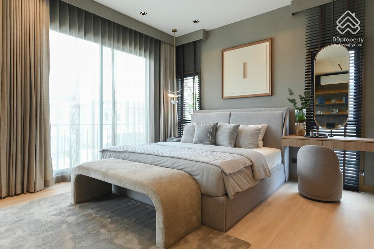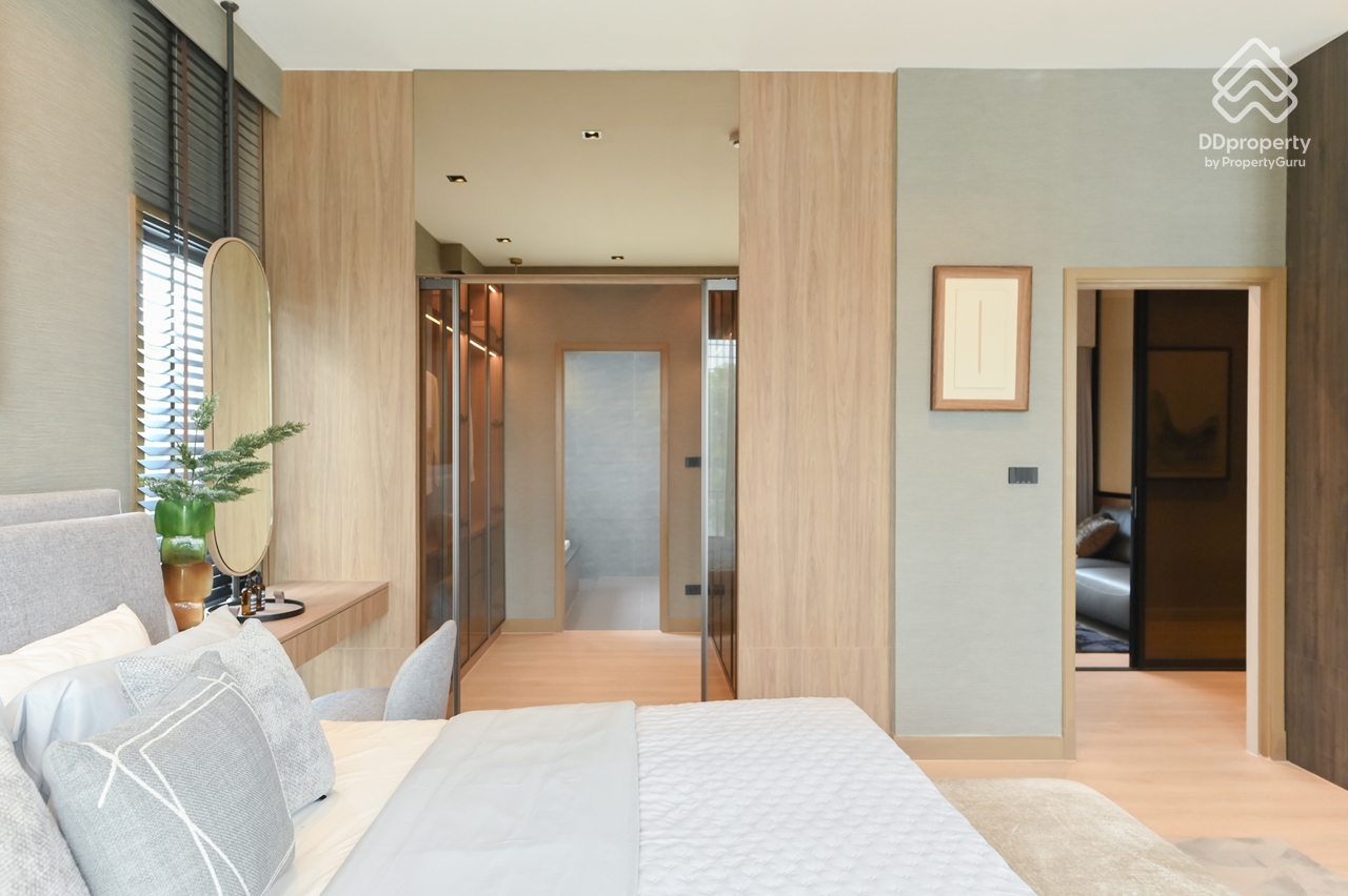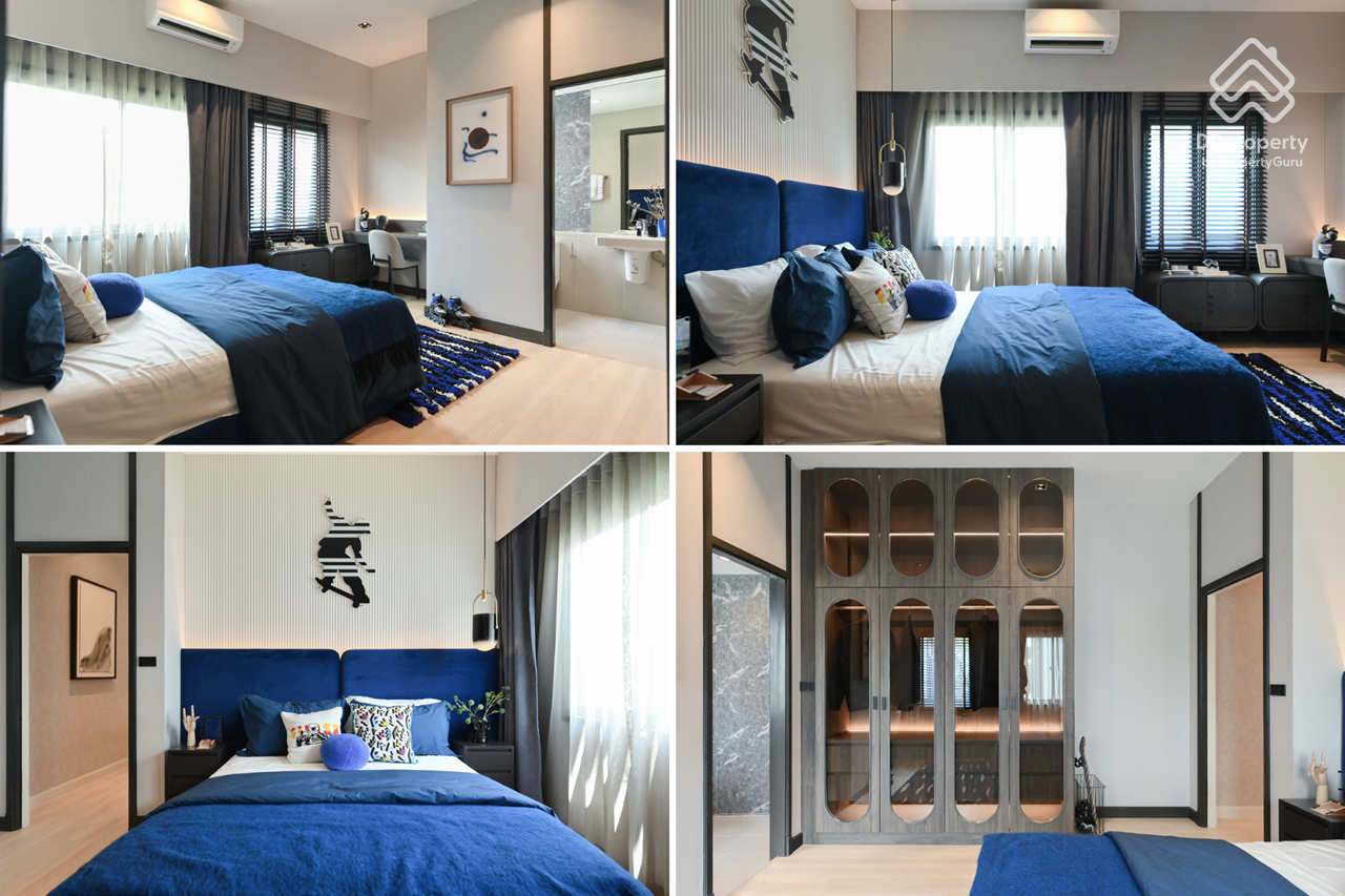 Master Bedroom มีขนาดกว้างขวาง และถูกจัดสรรพื้นที่เป็น 5 ส่วนหลัก ได้แก่ ห้องนอน, พื้นที่พักผ่อนส่วนตัว, Walk-in Closet, ห้องน้ำ และระเบียงส่วนตัว ภายในห้องสามารถวางเตียงขนาดคิงไซส์ได้อย่างสบาย โดยด้านซ้ายของห้องเชื่อมต่อกับระเบียงผ่านประตูกระจกบานเลื่อนแบบสองทาง ช่วยเปิดรับแสงธรรมชาติและวิวภายนอกได้อย่างเต็มที่