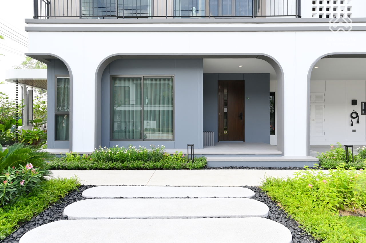 บ้านตัวอย่างเป็นแปลงมุมมีพื้นที่ด้านข้างเยอะ สามารถทำเป็นสวนส่วนตัว พร้อมศาลาสำหรับพักผ่อน เหมาะสำหรับการนั่งเล่น พูดคุย หรือทำกิจกรรมร่วมกับคนในครอบครัว โดยทางขวามือจะมีประตูกระจกขนาดใหญ่เชื่อมเข้าสู่ภายในบ้าน