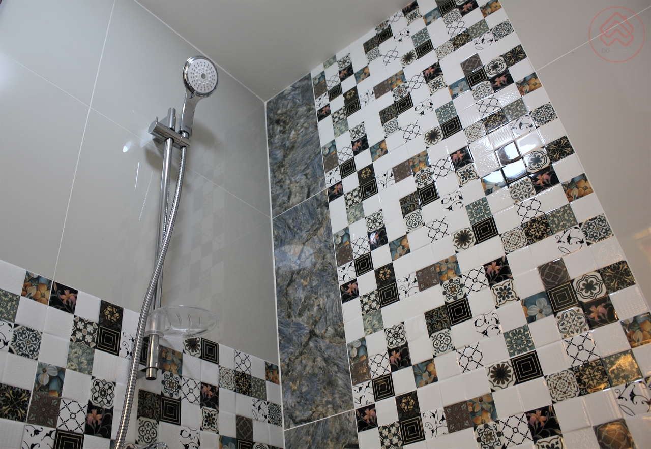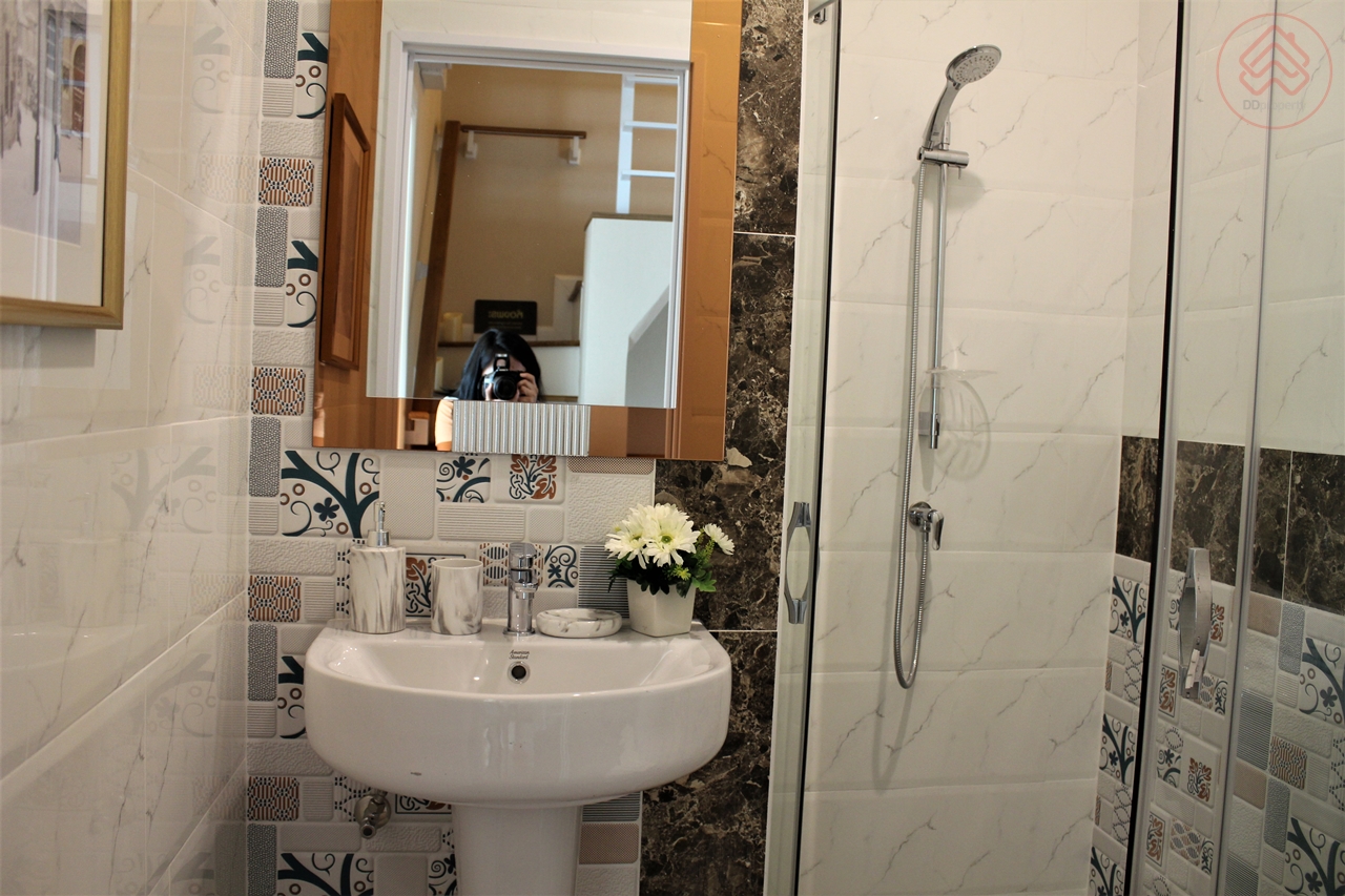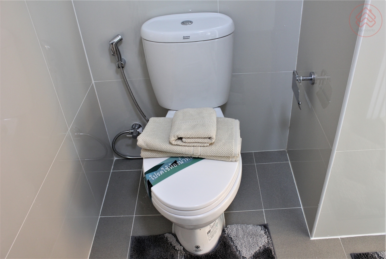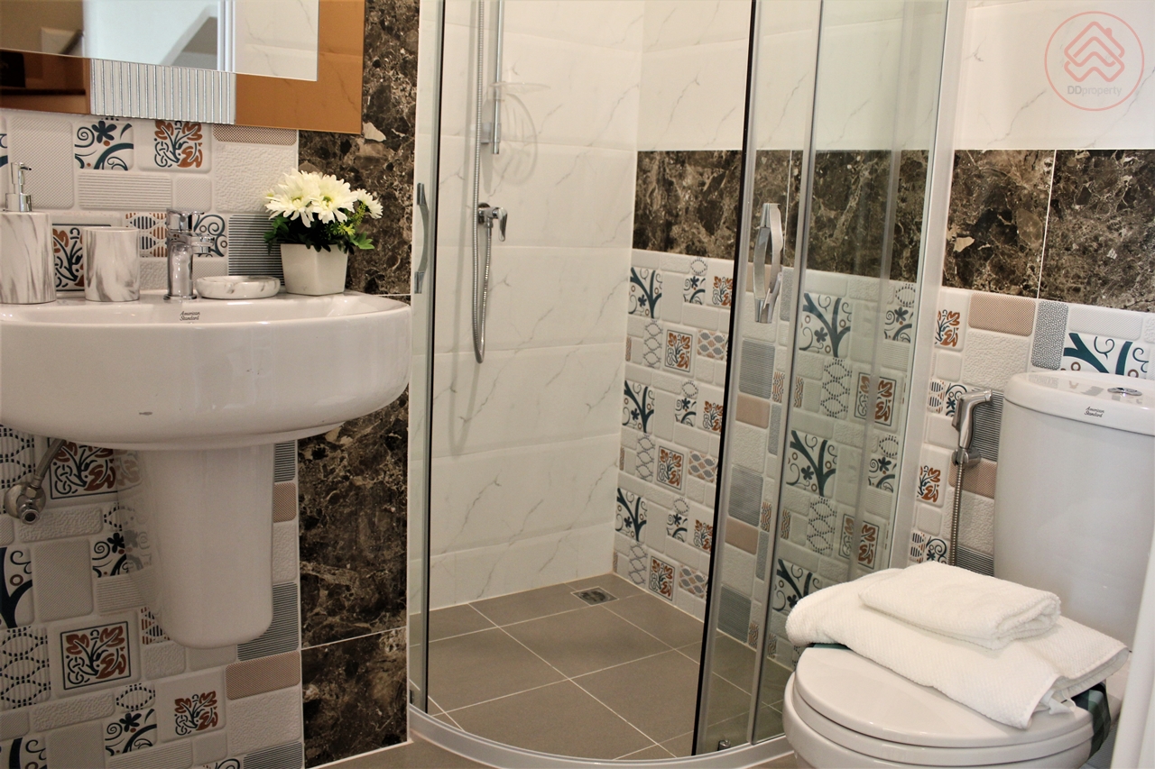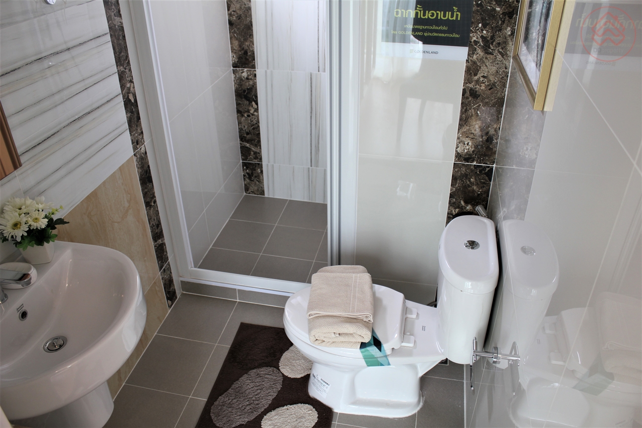 ตรงข้ามมุมโต๊ะทำงานก็จะเป็นห้องน้ำ ขนาดไม่ใหญ่มากแต่ก็ถือว่าใช้งานได้ดี ที่สำคัญทางโครงการยังแถมกระเบื้องตกแต่งห้องน้ำดีไซน์สวยเป็นเอกลักษณ์เฉพาะตัวให้อีกด้วย