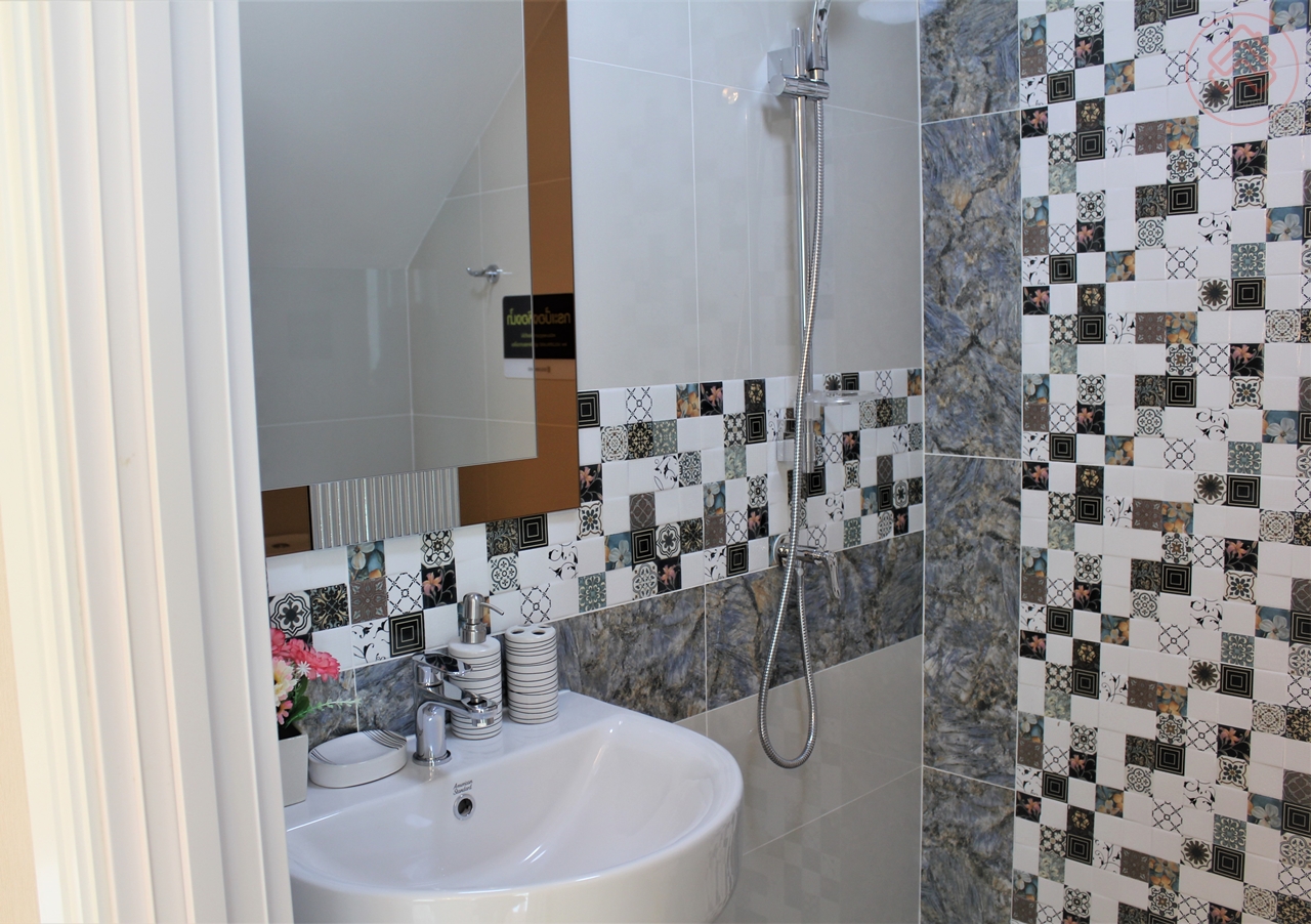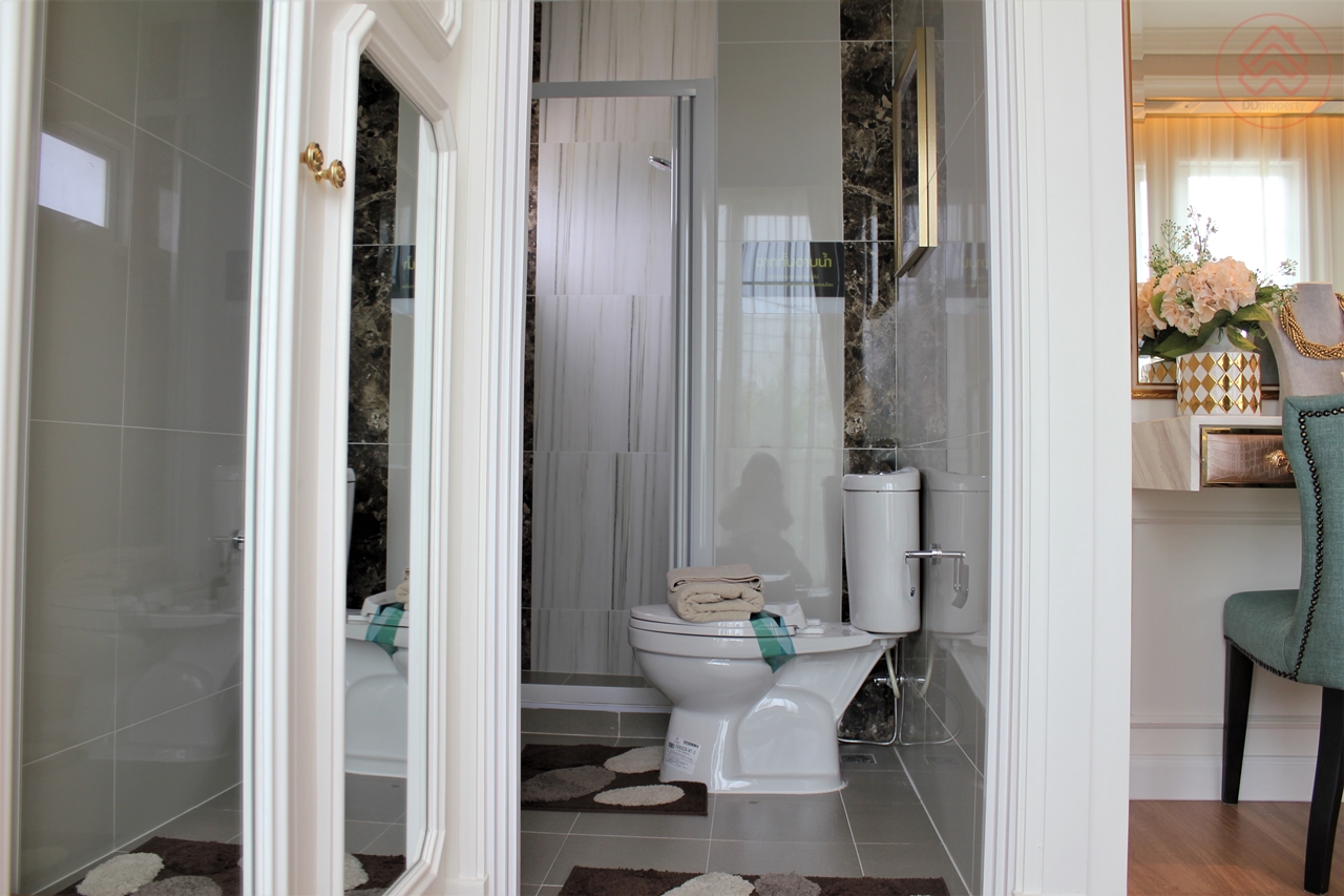 พร้อมฝ้าเพดานที่สูงสุดเกือบ 3 เมตร ทำให้โปร่ง สบาย อากาศถ่ายเทสะดวก เพิ่มความสง่างามให้กับบ้านได้อย่างมาก และอีกหนึ่งการออกแบบที่แถมให้ จะไม่พูดถึงคงไม่ได้อย่างแน่นอน นั่นก็คือ กระเบื้องห้องน้ำดีไซน์สวยเป็นเอกลักษณ์เฉพาะตัว ส่วนสุขภัณฑ์ก็คัดสรรแบรนด์ชั้นนำระดับพรีเมี่ยม มาให้ผู้อยู่อาศัยแบบจัดเต็มเลยทีเดียว