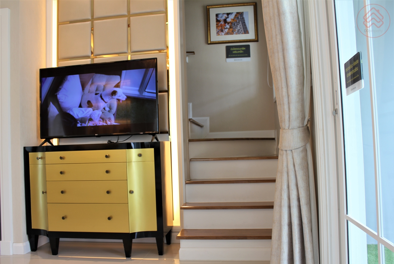 และยังเหลือพื้นที่สำหรับเป็นทางเดินเข้า-ออกบ้านได้บ้านได้กว้างเกือบ 1 ม. เลยดีเดียว ส่วนฝั่งตรงข้ามชุดโซฟาเป็นชั้นวางทีวีดีไซน์เข้าช่องผนัง ด้านข้างชั้นวางทีวี หรือ ทางขวามือของทางเข้าบ้านก็จะเป็นบันไดขึ้นไปสู่ชั้น 2 ขนาดไม่ใหญ่มาก เดินขึ้นและลงคนเดียวกำลังดี ไม่อึดอัด