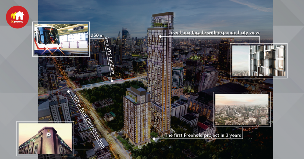 SC Asset has a claim on the last land plot possible for new development on Chidlom Road. They purchased it in a freehold term with a record price at THB 1.9 million per square wah, and takes this invaluable piece of land to raise up a top-notch luxury condominium 28 Chidlom. The project comprises two high-rise buildings The Tower and The Villa, standing apart where natural surroundings fulfills the in-between space on the ground floor. Elegant by the Jewel-box facade, a world-class design of glass-encased balconies which brings a breathtaking expanded city vista for residents, who would dwell in an airy 3-metre-high prestigious room. The location is priceless. The price would skyrocket. At the moment, start at THB 14 million with over half of the units already sold in the first phase, at the time of writing.