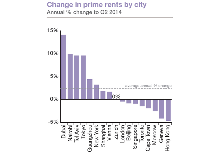 Despite occupying the top two rankings, Dubai and Nairobi saw the rate of prime rental growth soften in the second quarter. Although London, Singapore and Hong Kong saw prime rents decline in the year to June, the rate of decline is slowing.