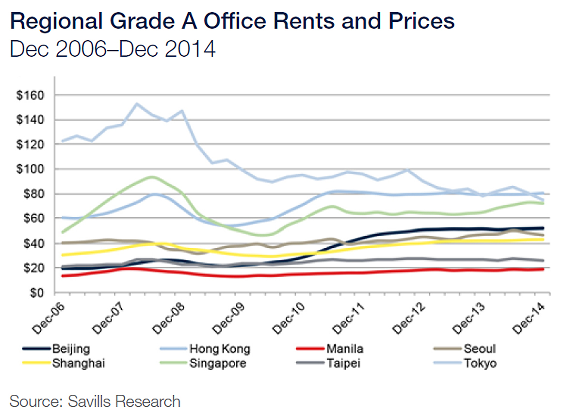 In ascending order, the markets with the lowest and highest effective yields are Hong Kong (2.85 percent), New York (3.29 percent), L.A. West (3.31 percent), London (3.39 percent), Tokyo (3.65 percent), Paris (3.84 percent), Munich (4.04 percent), Sydney (4.21 percent), Shanghai (4.25 percent), Singapore (4.85 percent) and San Francisco (5.39 percent).