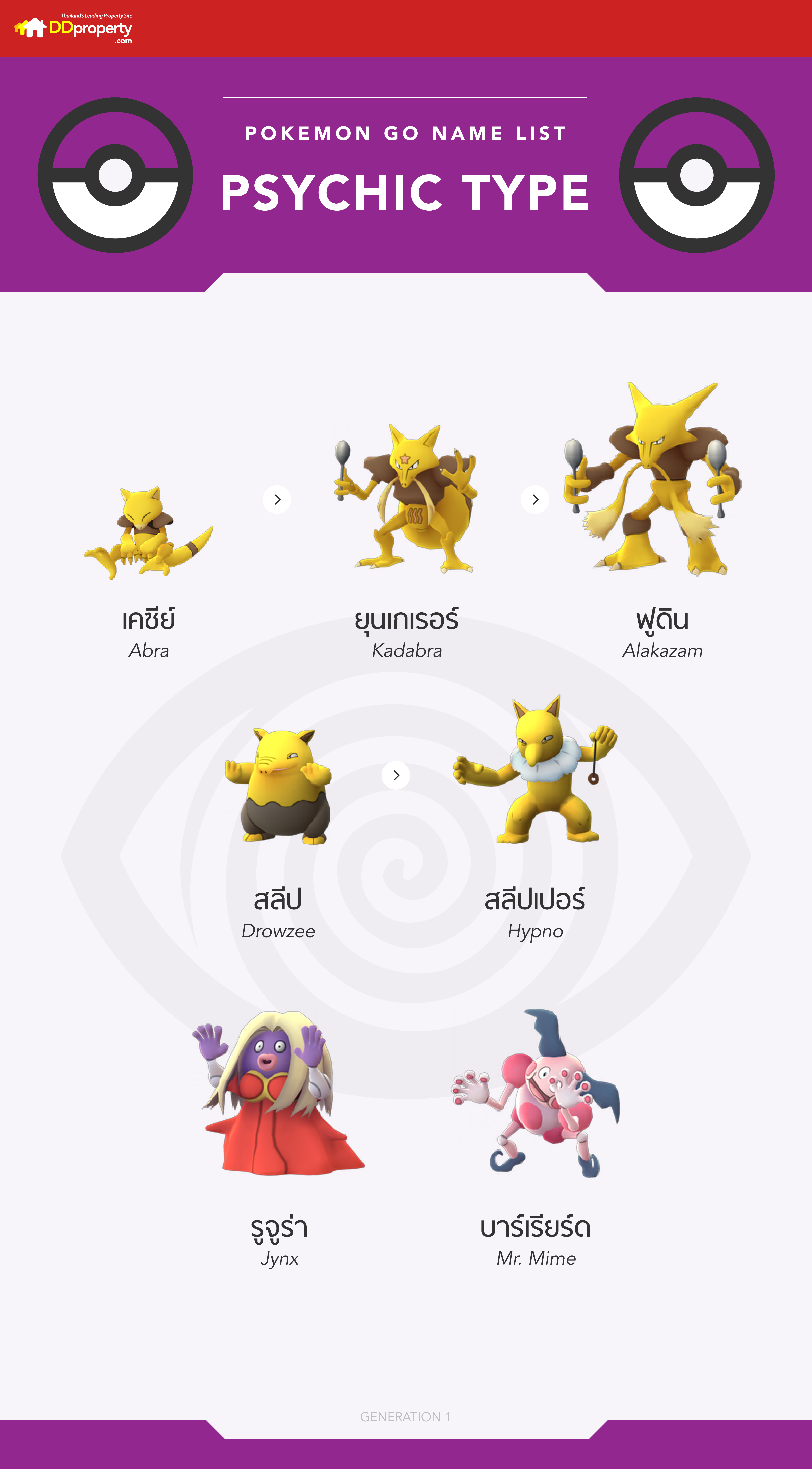 มาต่อกันที่ รายชื่อโปเกมอนโก (Pokémon Go) ธาตุพลังจิต ทั้งชื่อภาษาญี่ปุ่นและชื่อภาษาอังกฤษกันเลย