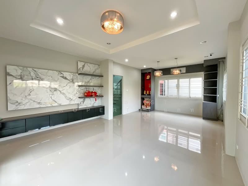 ห้องรับแขกสุดหรู: กว้างขวาง ปูพื้นกระเบื้องแกรนิตโต้เงางาม พร้อมเฟอร์นิเจอร์ Built-in ชั้นวางทีวีลายหินอ่อนสุดพรีเมียม