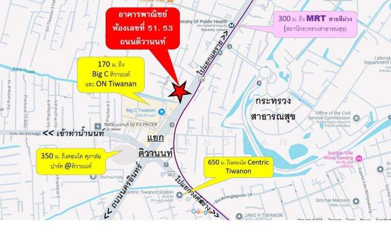 - อยู่ทำเลสี่แยกติวานนท์ เดินทางสะดวกด้วยรถไฟฟ้า MRT สถานีกระทรวงสาธารณสุข (ห่างเพียง 350 เมตร)