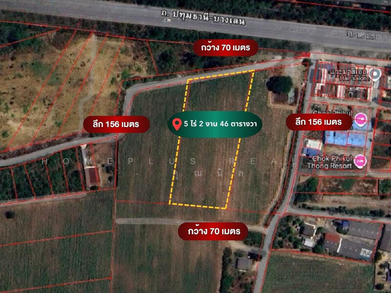 เนื้อที่ 5 ไร่ 2 งาน 46 ตารางวา l กว้าง 70 เมตร l ลึก 156 เมตร l หันหน้าไปทางทิศตะวันตกเฉียงใต้